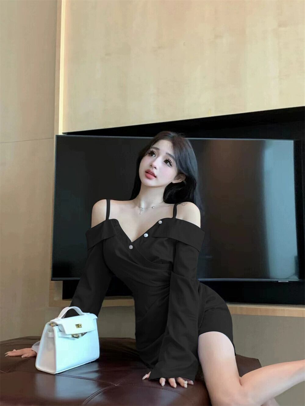 純粋な欲望甘いスパイシーなサスペンダーオフショルダー長袖 V ネックウエストスリム不規則なドレスエンドセレブショートスカート女性 ロング 大人ガーリー スウィート キュート カジュアル Vネック nana2005416277 | modepoisson