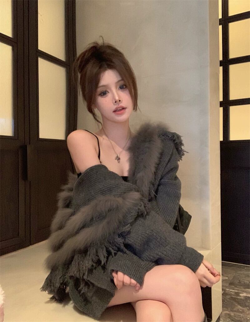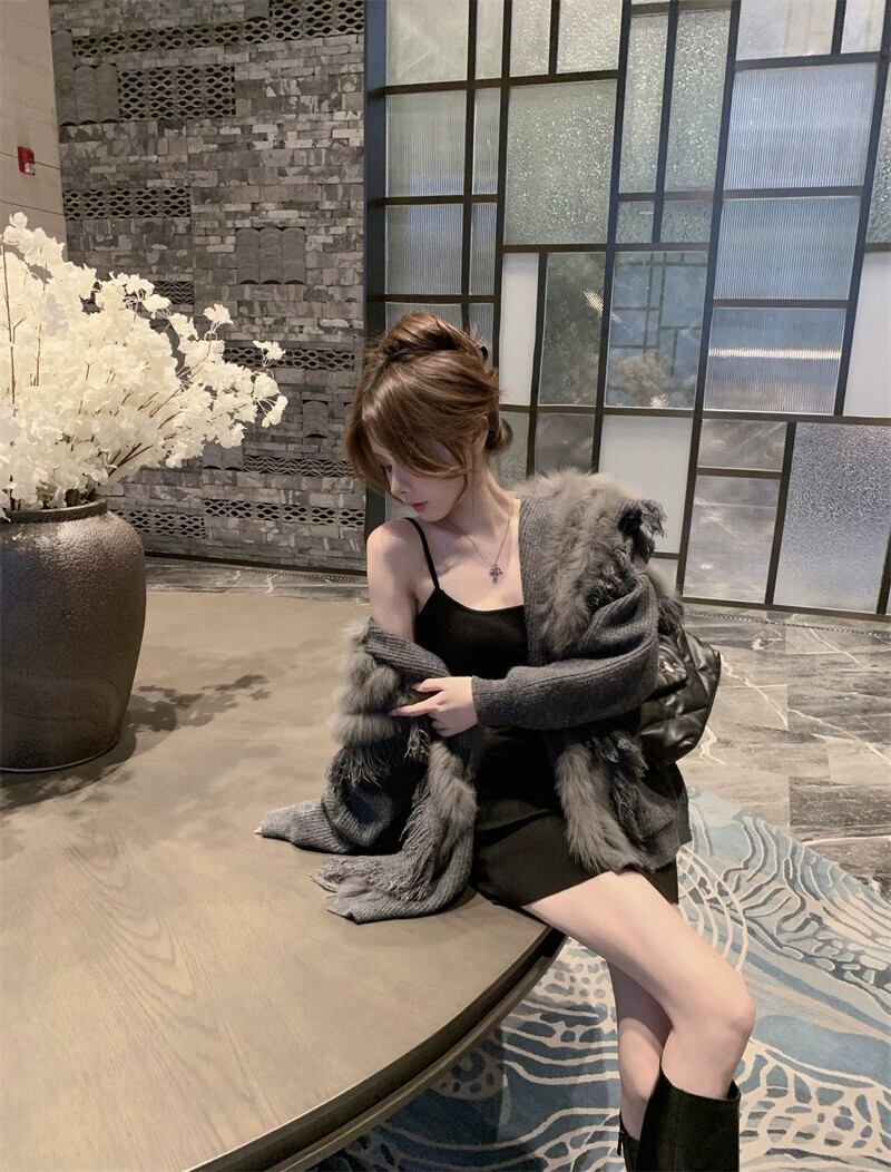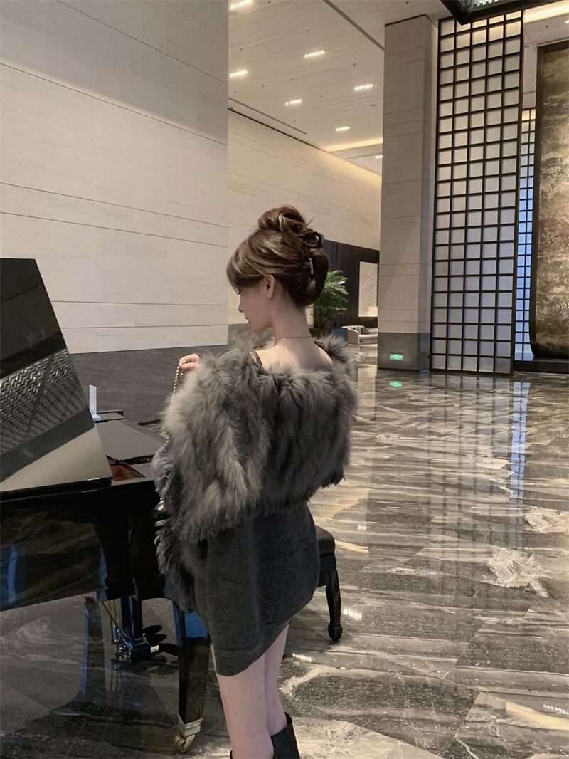 色:グレーの毛皮のラペルセーター,黒のセクシーなヒップスカート