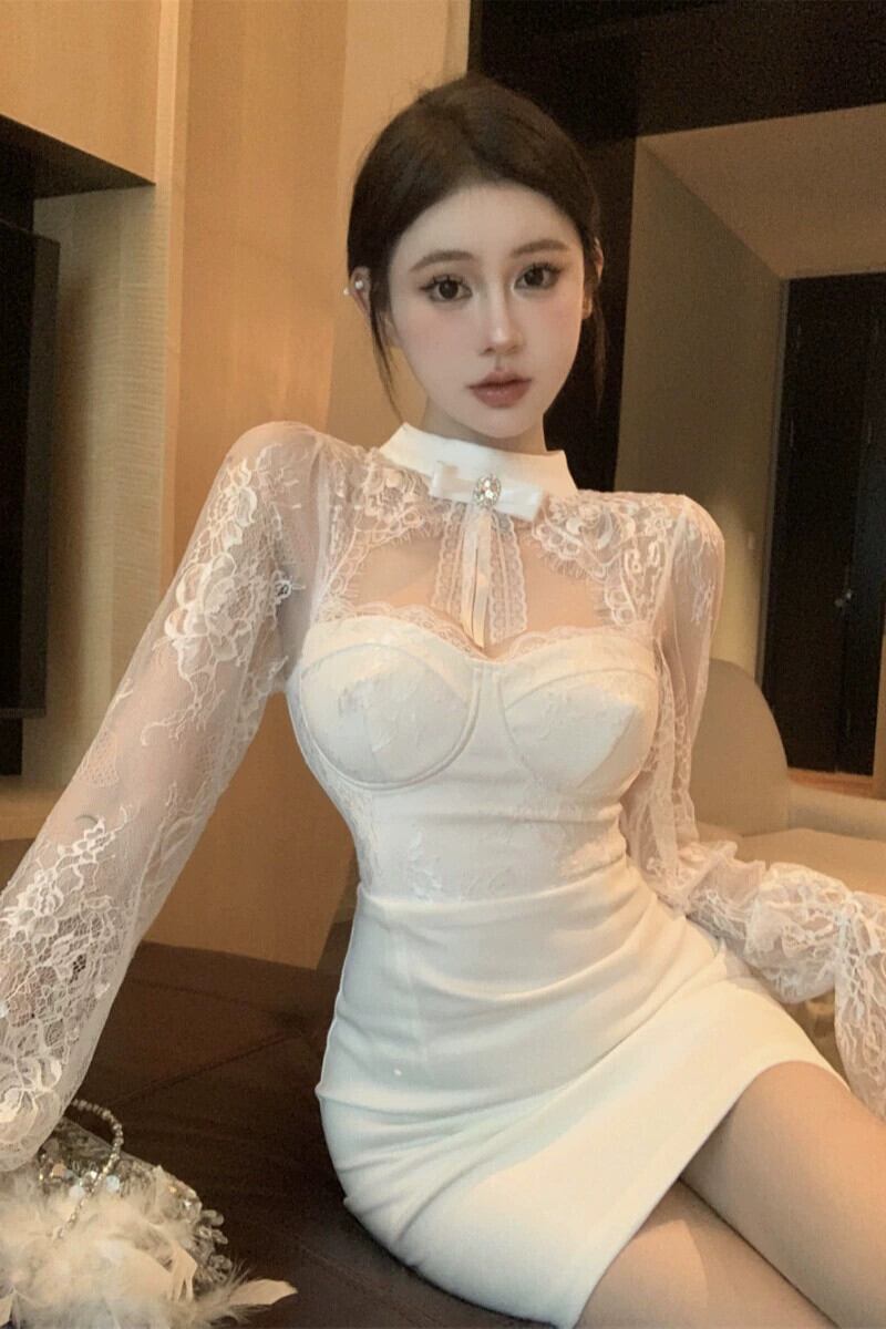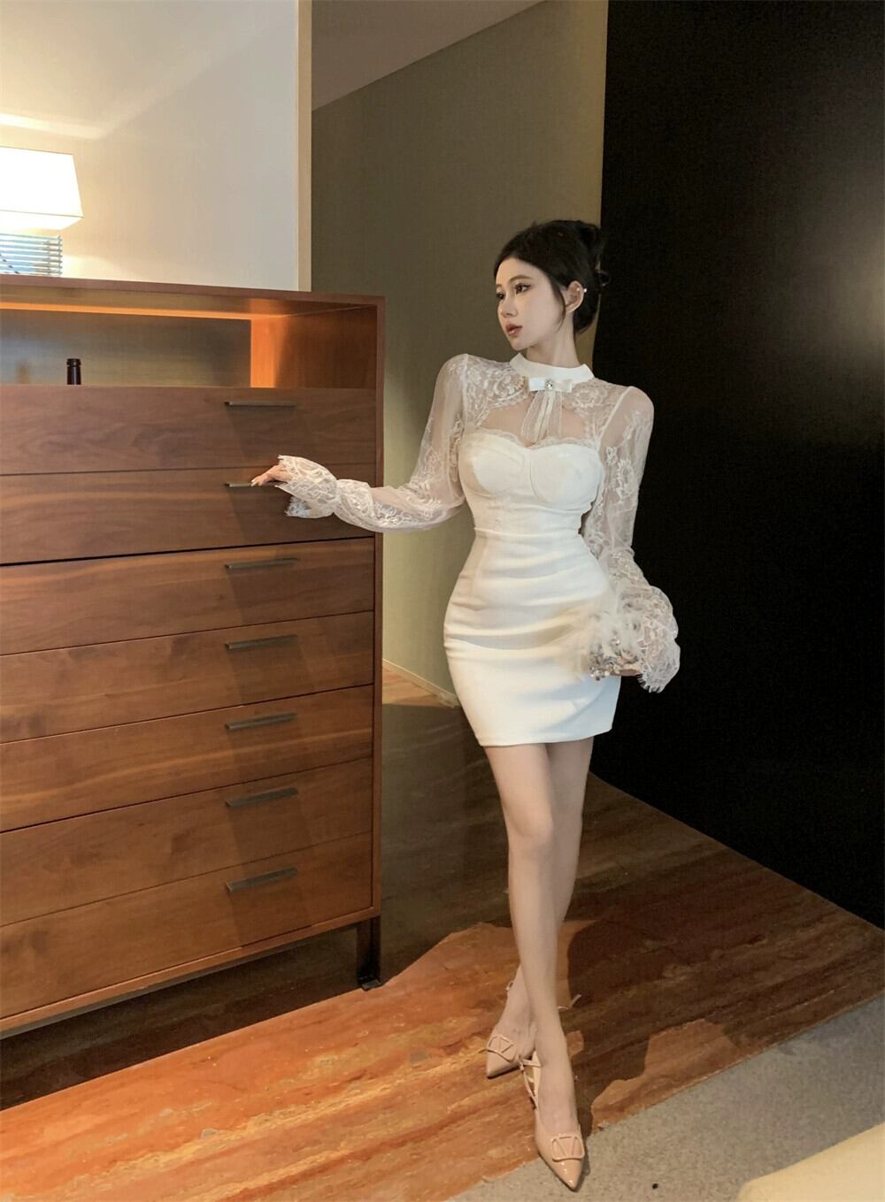 気質レース中空バンドゥヒップカバードレス女性の秋と冬のフランスのハイエンドスリムスリム長袖ショートスカート ロング オータム 秋物 ウィンター 冬物 nana13993924371 | modepoisson