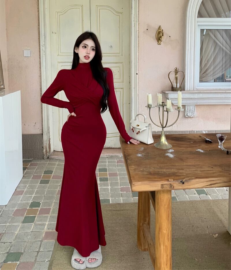 タイトフィット長袖お尻をカバーするフィッシュテールドレス、ロングスカートの内側にデザインが付いている女性の秋と冬の新しいスタイルのハイエンドの気質スカート オータム 秋物 ウィンター 冬物 nana41726382317 | modepoisson