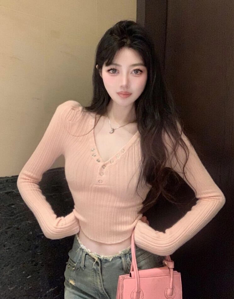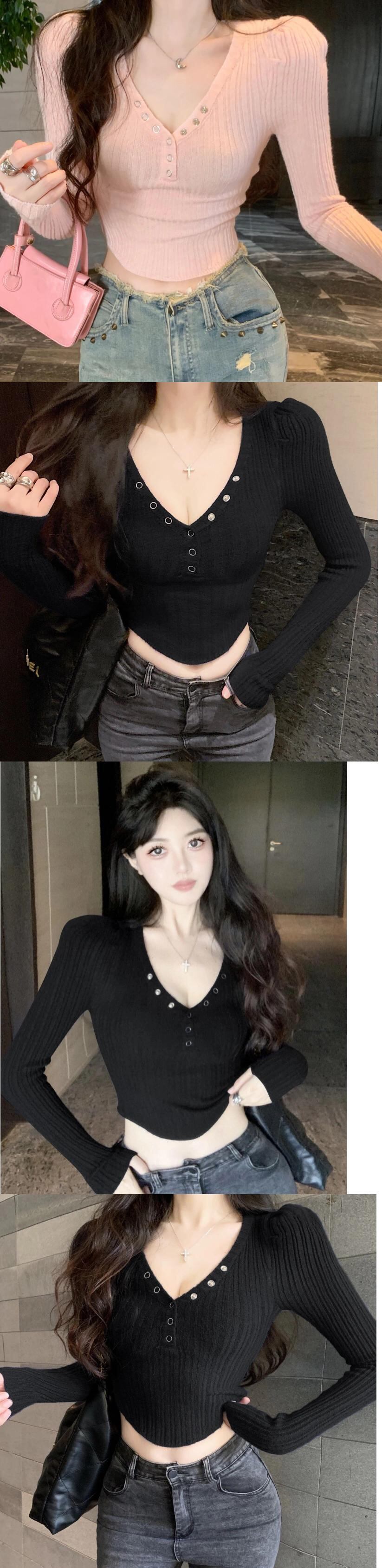 長袖 V ネック セーター、ボトムス セーター、怠惰で高級感のある、秋冬のスリムフィット ショート トップ レディース ロング オータム 秋物 ウィンター 冬物 Vネック nana59360655562 | modepoisson