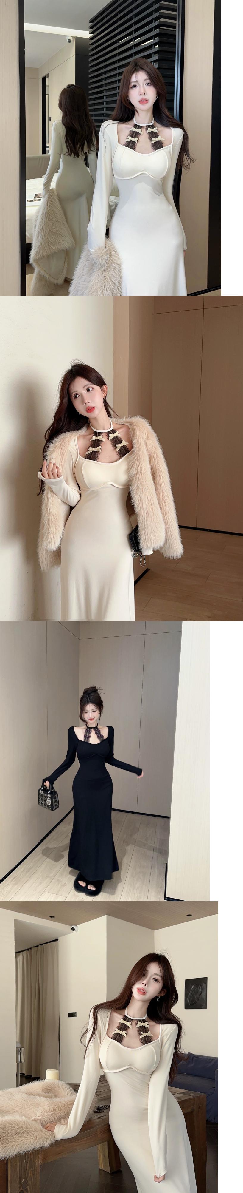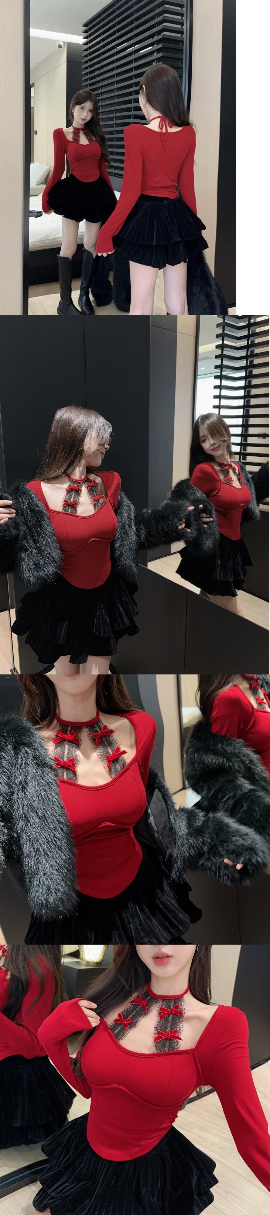 ホルターネックレースボトニングシャツ長袖 Tシャツ秋と冬クリスマスレッドスリムデザインニッチショートトップ女性 ロング オータム 秋物 ウィンター 冬物 nana7140151653 | modepoisson