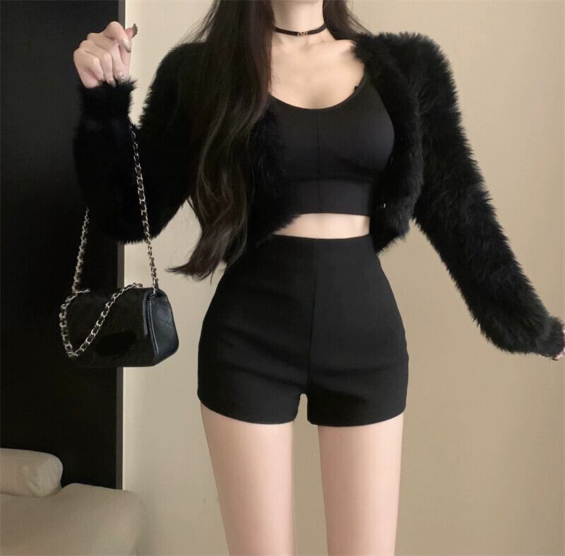 -ウエストスリムカジュアルパンツ、黒のベルベットショートパンツ、伸縮性のあるアウターウェア、タイトフィットの秋冬の新しいスタイルのレギンス ブラック エラスティック オータム 秋物 ウィンター 冬物 ショーツ ブルマー nana13798283642 | modepoisson