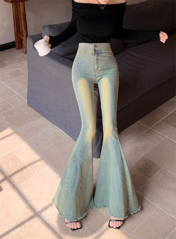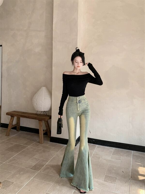 -ウエストレトロジーンズレディース2023年秋新作スリムストレートパンツラージフレアワイドレッグローエッジパンツ オータム 秋物 ワイドパンツ nana57922355342 | modepoisson