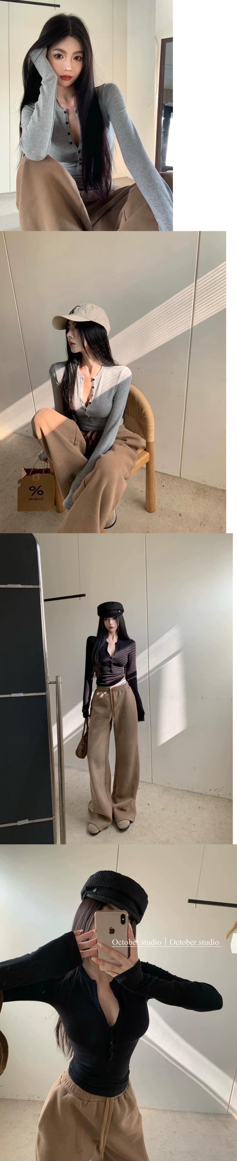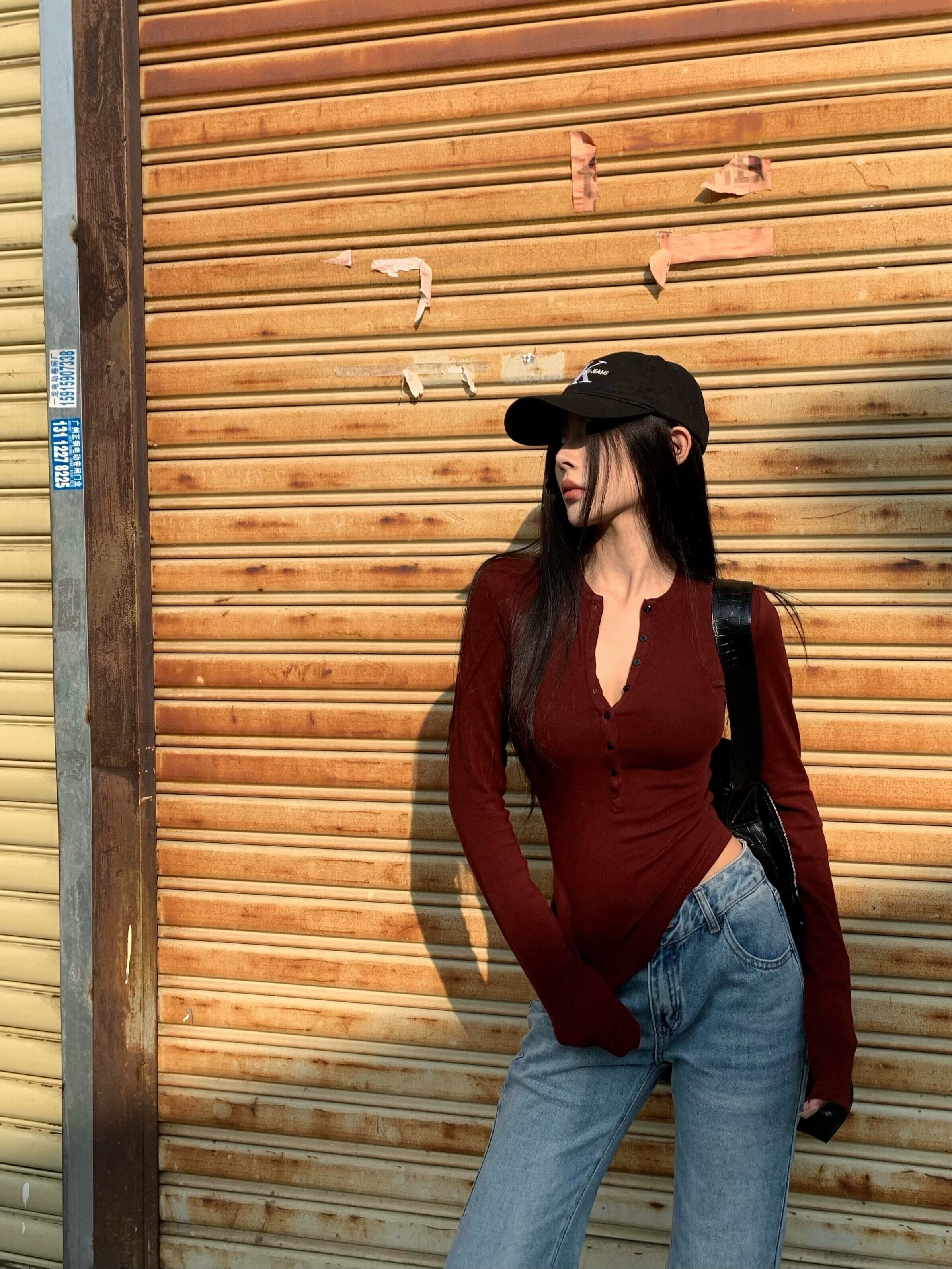アメリカンショート長袖Tシャツレディース秋冬デザインニッチボトリングシャツ弾性スリムフィットインナーVネックトップ ロング エラスティック 伸縮 オータム 秋物 ウィンター 冬物 nana57135246105 | modepoisson
