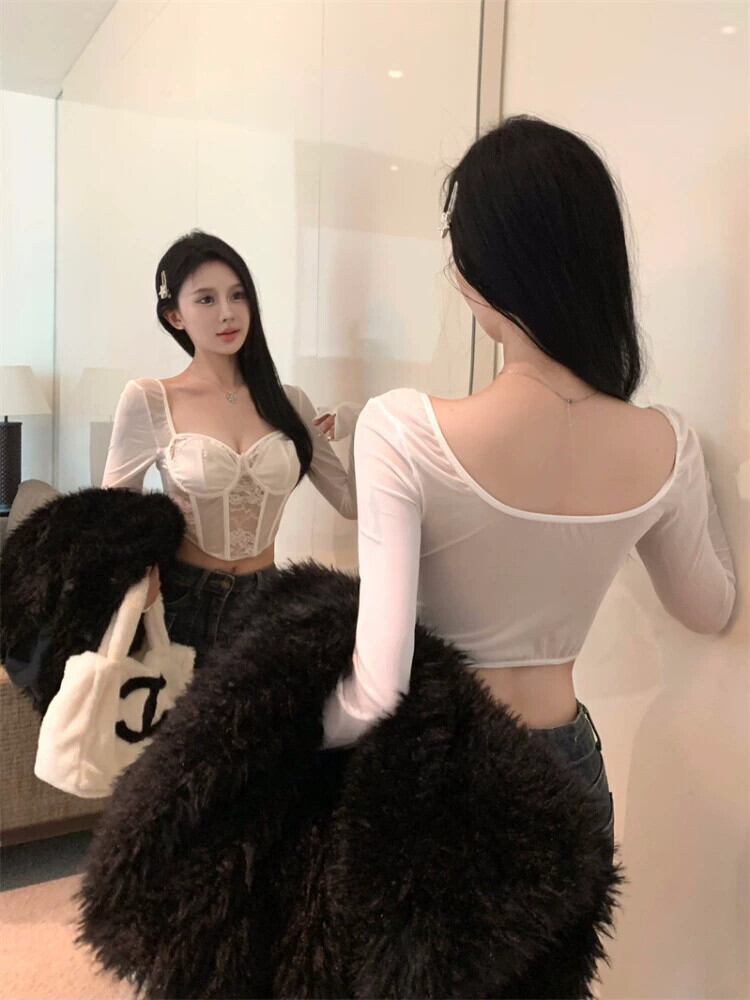 ホットアメリカンレトロ tシャツ女性の秋と冬のセクシーなレースメッシュスリムボトムシャツ長袖ショートトップ ロング オータム 秋物 ウィンター 冬物 nana47194158345 | modepoisson