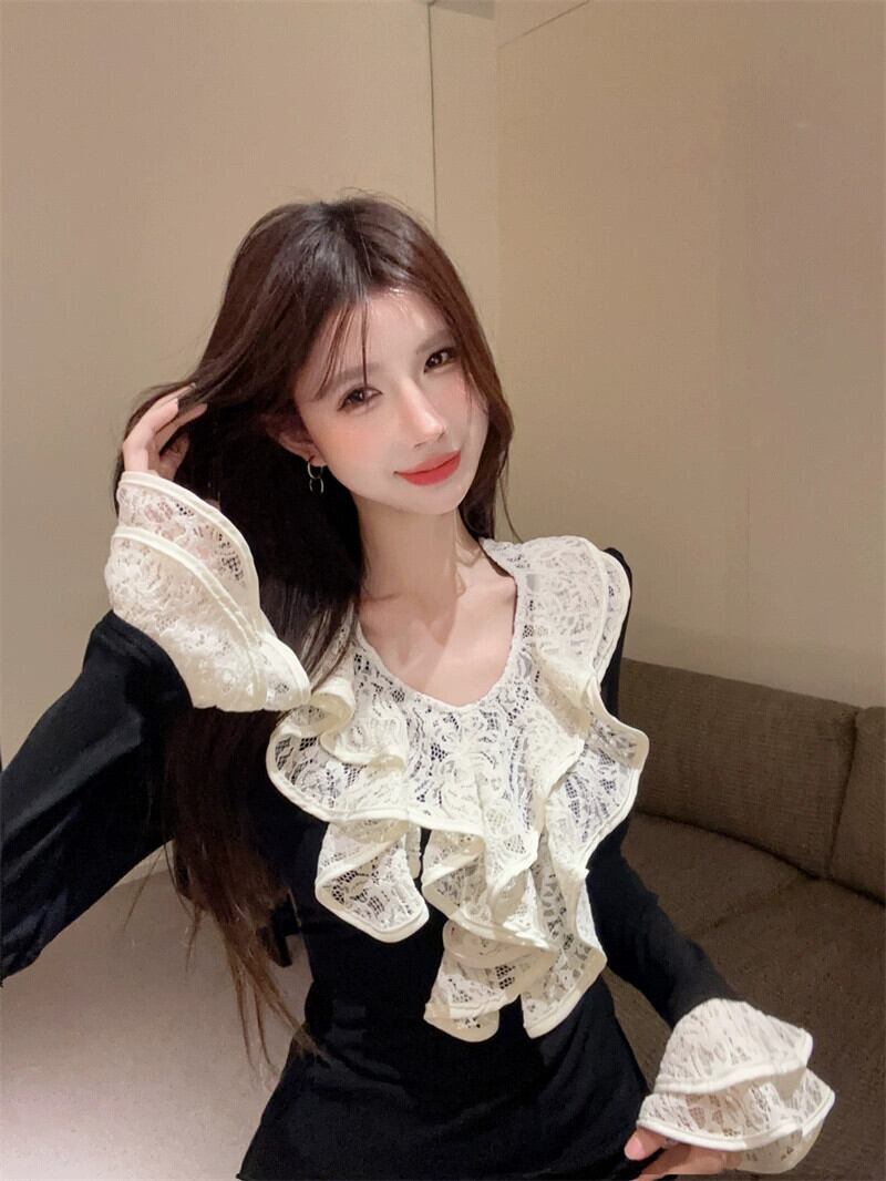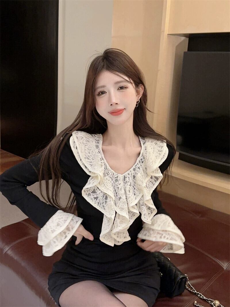 純粋な欲望 V ネック長袖レース Tシャツ女性の秋と冬の新しいスタイルのスプライシングフリルデザインニッチボトリングシャツトップ ロング オータム 秋物 ウィンター 冬物 Vネック nana32220926075 | modepoisson