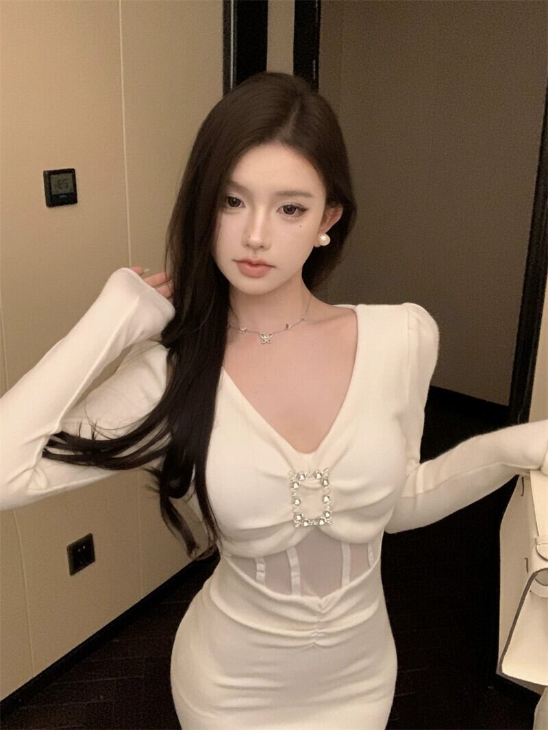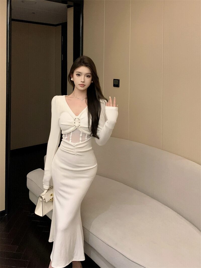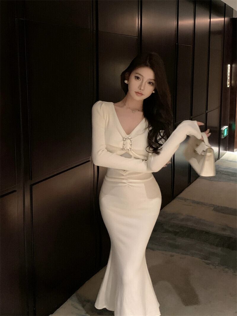 スリムスリムフィッシュテールドレスの女性の秋と冬の新しいスタイルフランス長袖気質女性 V ネックスカート底ロングスカート オータム 秋物 ウィンター 冬物 Vネック nana96564515219 | modepoisson