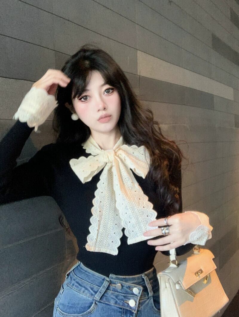フランス長袖セーター女性の秋と冬のボトリングシャツ黒スリムフィットレースリボンセータートップ ロング ブラック オータム 秋物 ウィンター 冬物 nana53934442315 | modepoisson