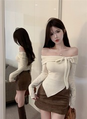 スリムフィット純粋な欲望スタイル長袖 Tシャツ女性のワンショルダー不規則なボトムシャツ秋と冬の甘くてセクシーなトップ ロング 大人ガーリー スウィート キュート カジュアル オータム 秋物 ウィンター 冬物 ピュア nana13212101608 | modepoisson