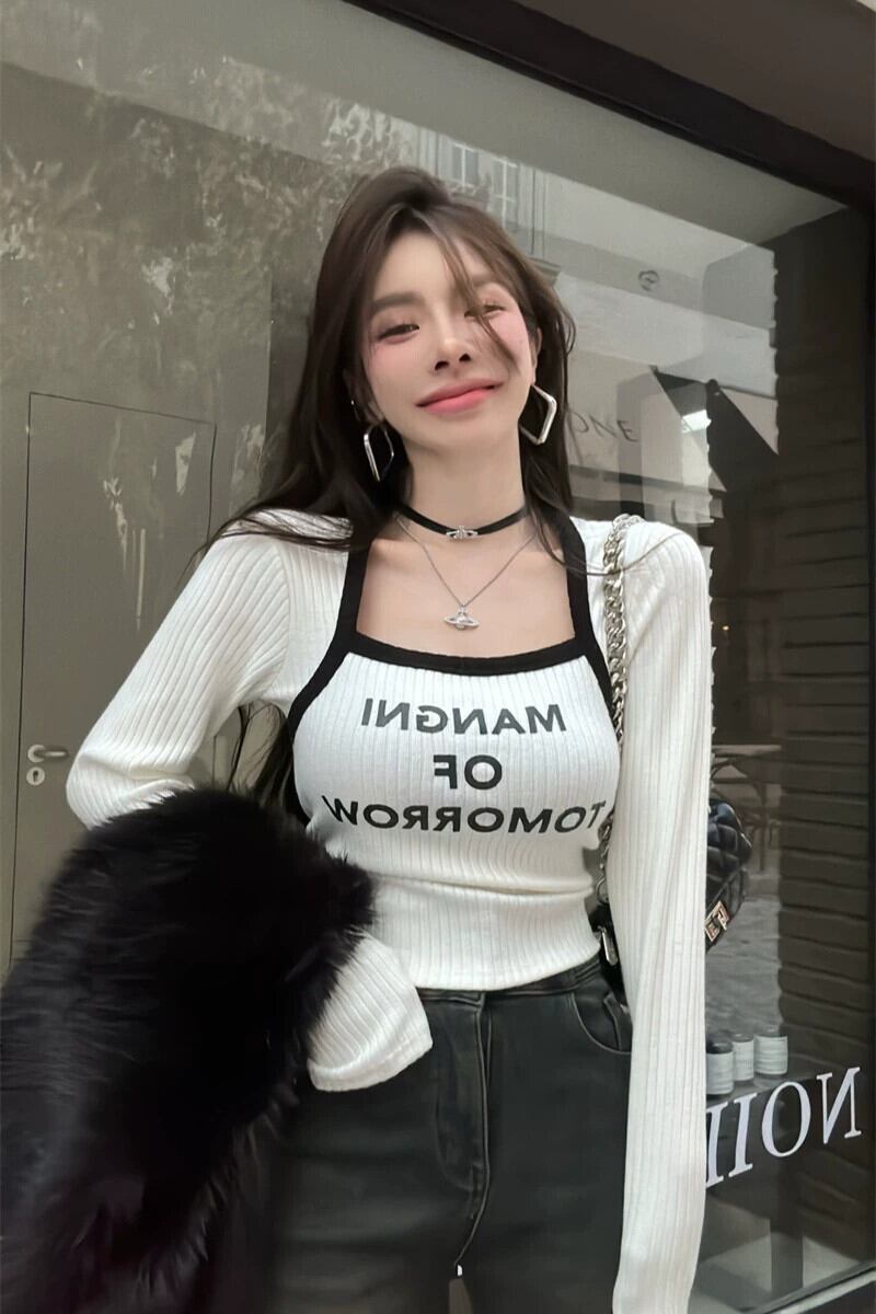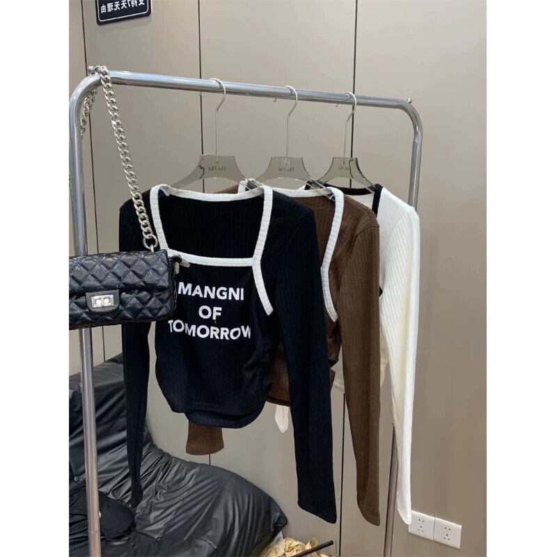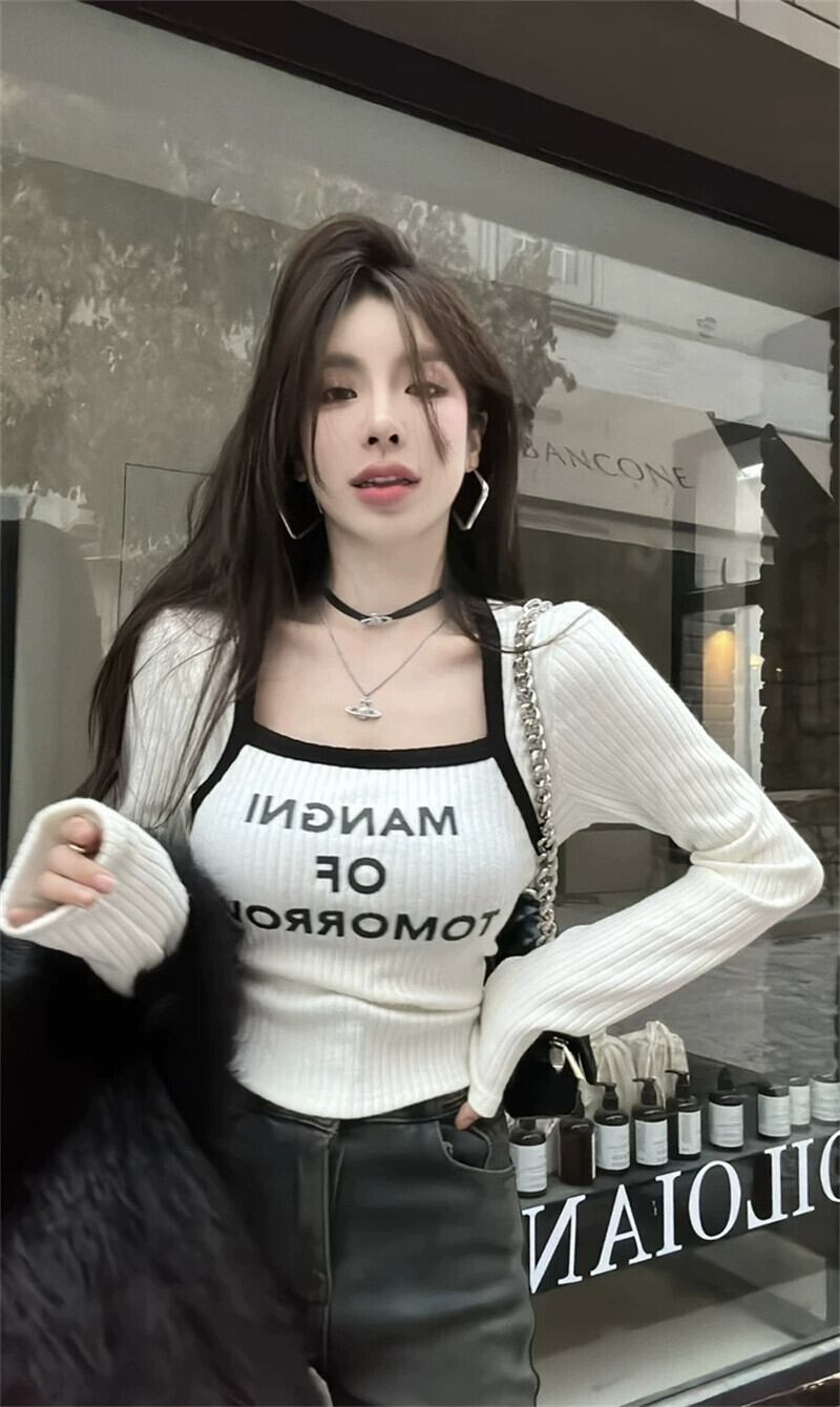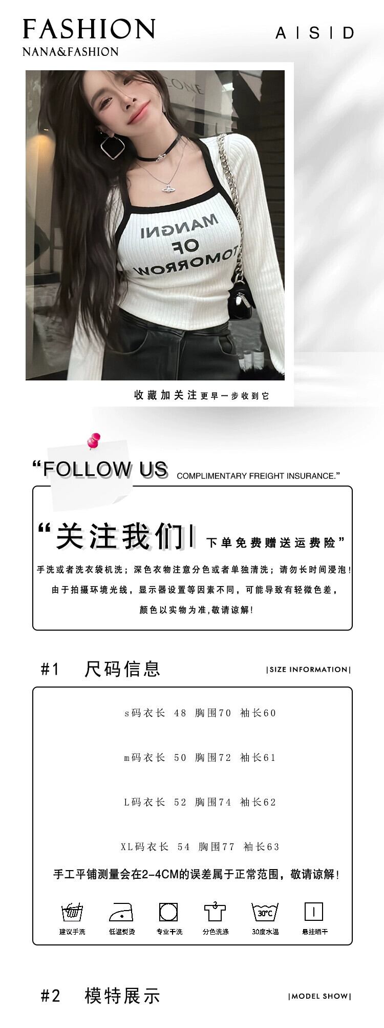 スクエアネック長袖 Tシャツ多用途レタープリントニッチスリムフィットボトシャツトップス女性 2023 秋冬新スタイル ロング オータム 秋物 ウィンター 冬物 スクウェア nana3692958590 | modepoisson