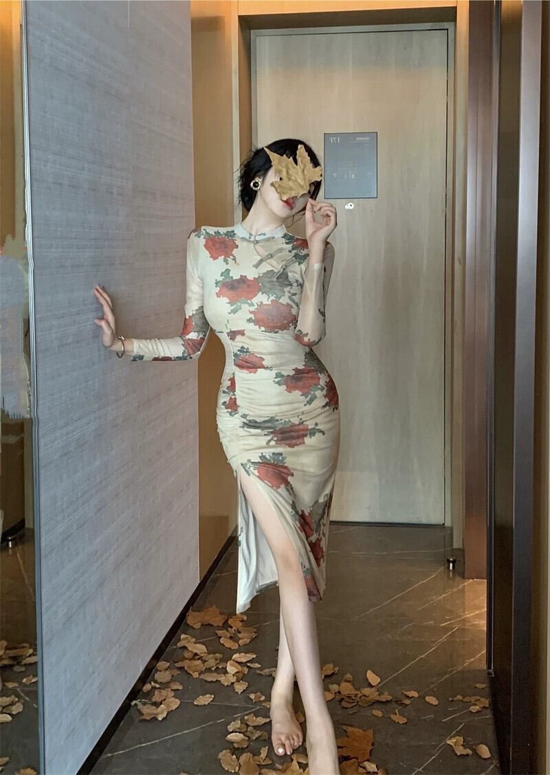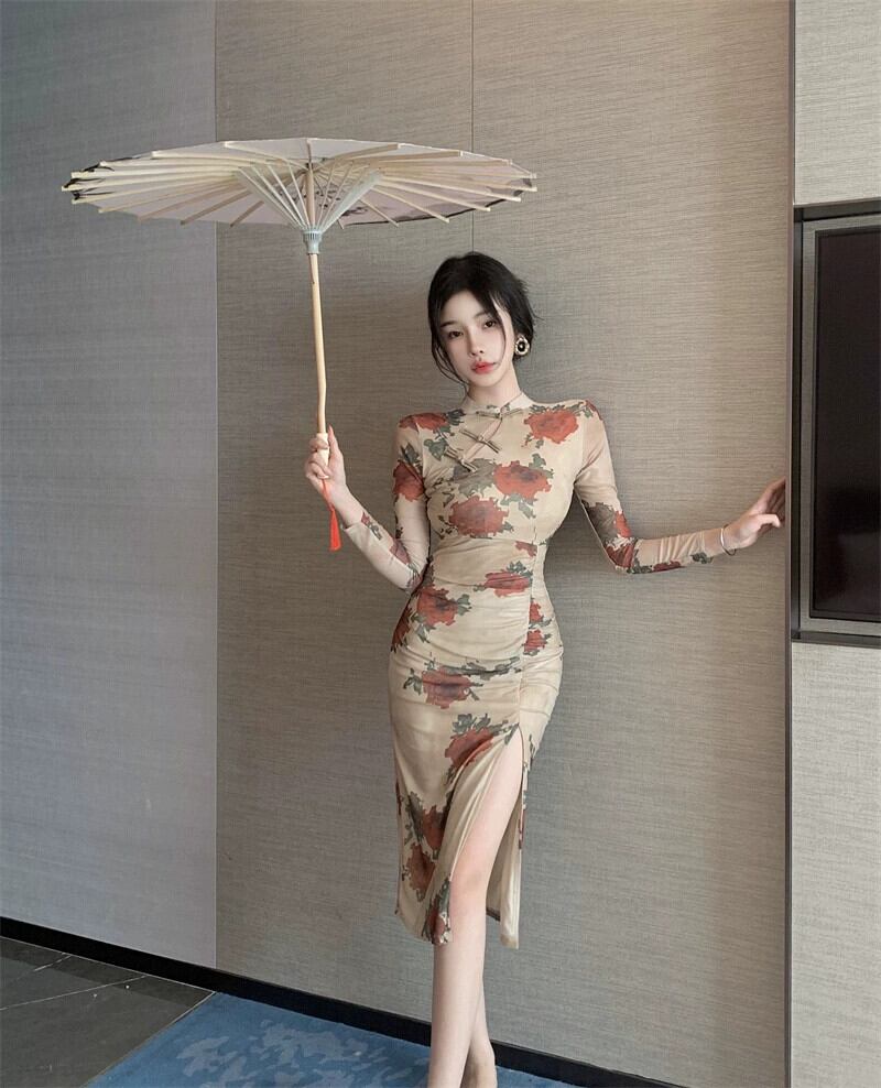 レトロな気質チャイナドレス女性の秋と冬の新しい改良されたスリットメッシュウエスト痩身スリムヒップラップスカート オータム 秋物 ウィンター 冬物 nana67043150027 | modepoisson