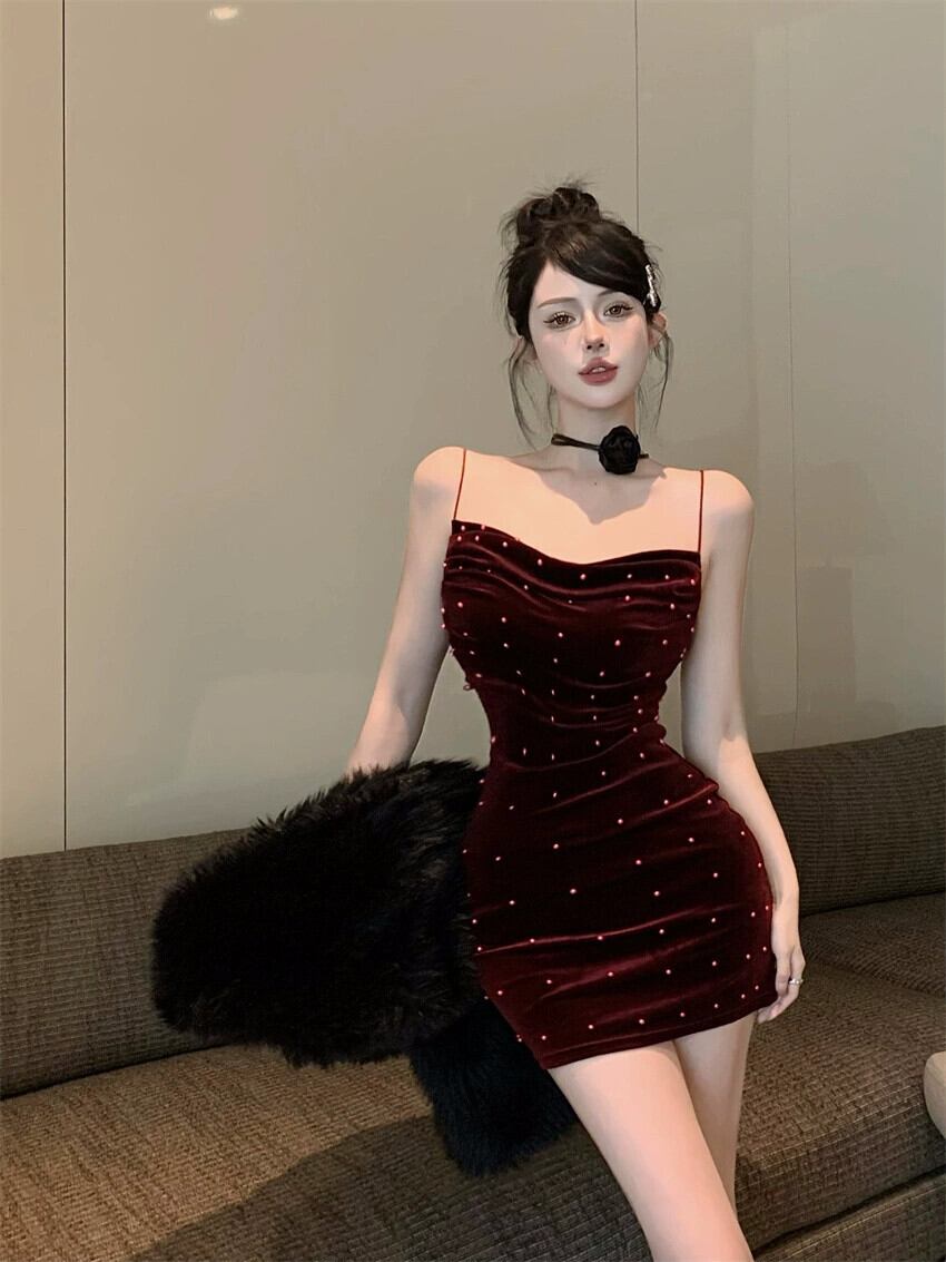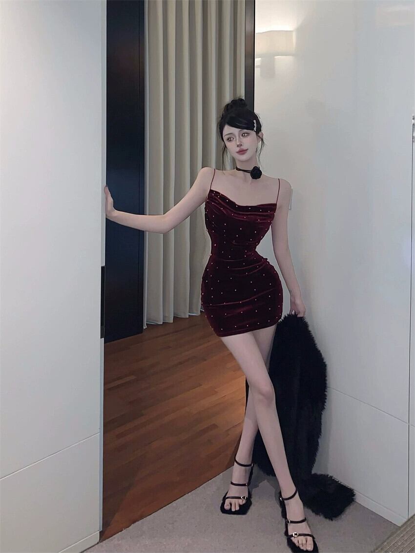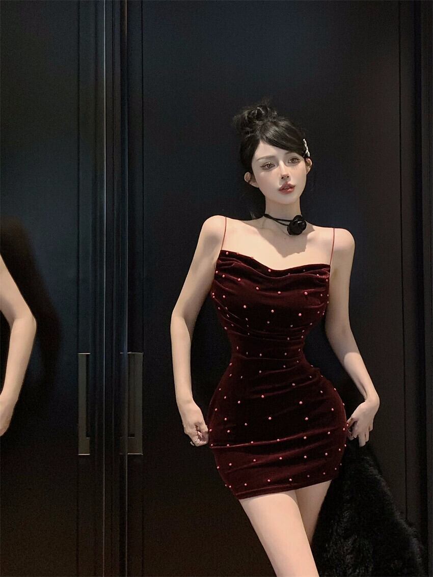 セクシーなベルベットサスペンダードレス秋と冬の新パールデザインウエスト痩身スリムヒップショートスカート女性 オータム 秋物 ウィンター 冬物 真珠 nana70654818036 | modepoisson