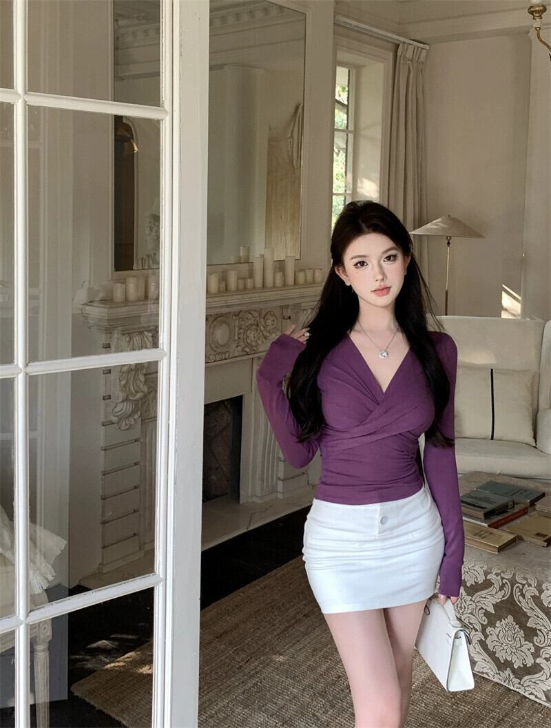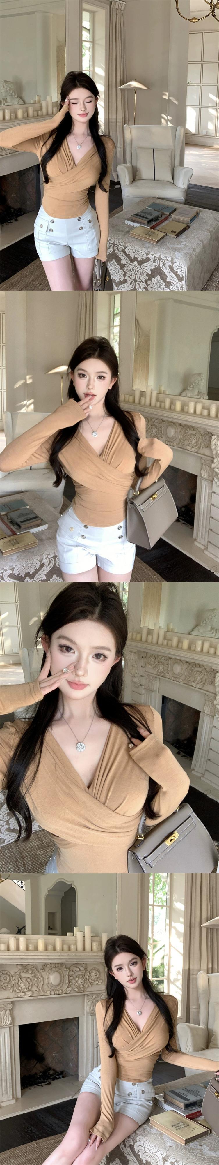 長袖 Tシャツ クロス V ネック セーター気質ボトリング シャツ女性の秋と冬の新しいニッチ スリム プルオーバー インナー トップ ロング オータム 秋物 ウィンター 冬物 Vネック nana63111076417 | modepoisson