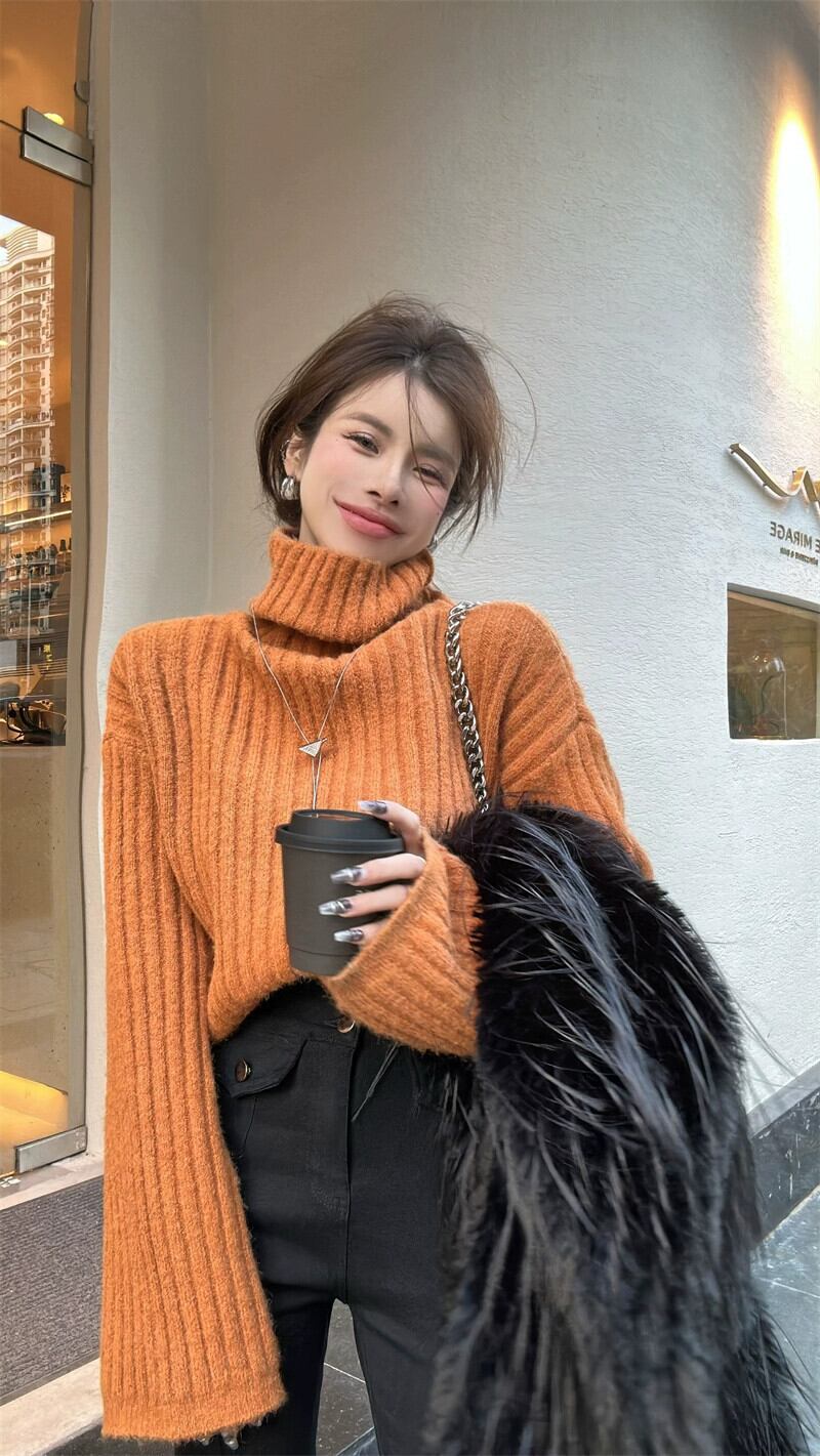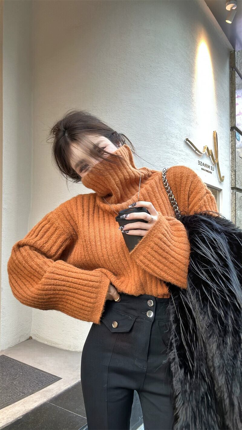 -ネック長袖厚手の赤いセーターの女性の秋と冬2023新しい緩い怠惰なスタイルのスリムショートニットトップ ロング レッド オータム 秋物 ウィンター 冬物 nana87137188689 | modepoisson