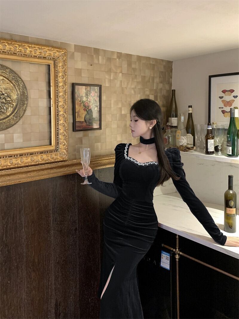 秋冬のフレンチスタイルの高級フィッシュテールロングスカートの女性と重いベルベットのヒップスカートの赤いドレス レッド オータム 秋物 ウィンター 冬物 nana12569760634 | modepoisson