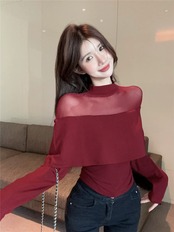 長袖Tシャツレディース、スリムフィットメッシュスプライシングボトムシャツ、秋冬の新スタイル、アメリカンニッチインナーウェア、スリミングトップ ロング オータム 秋物 ウィンター 冬物 nana42474742844 | modepoisson