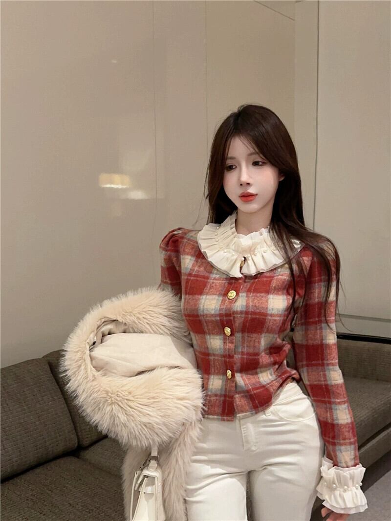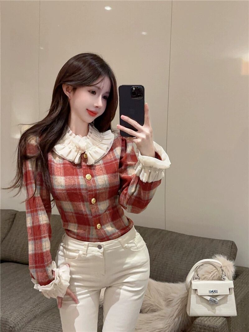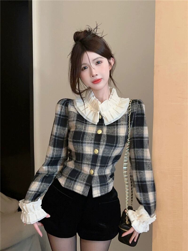 リッチ娘レトロチェック柄シャツ人形襟甘い長袖フレンチニッチショートコート女性の秋冬トップ ロング 大人ガーリー スウィート キュート カジュアル オータム 秋物 ウィンター 冬物 nana44519441449 | modepoisson