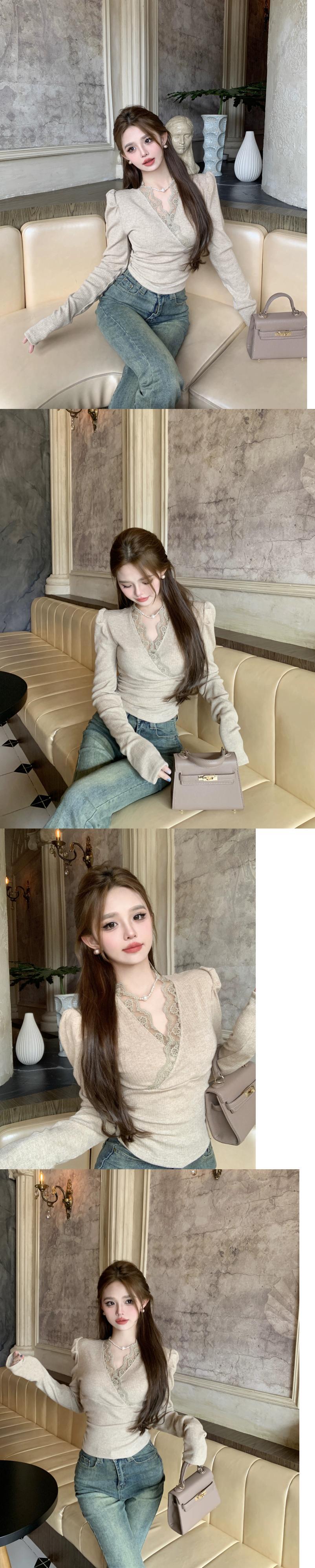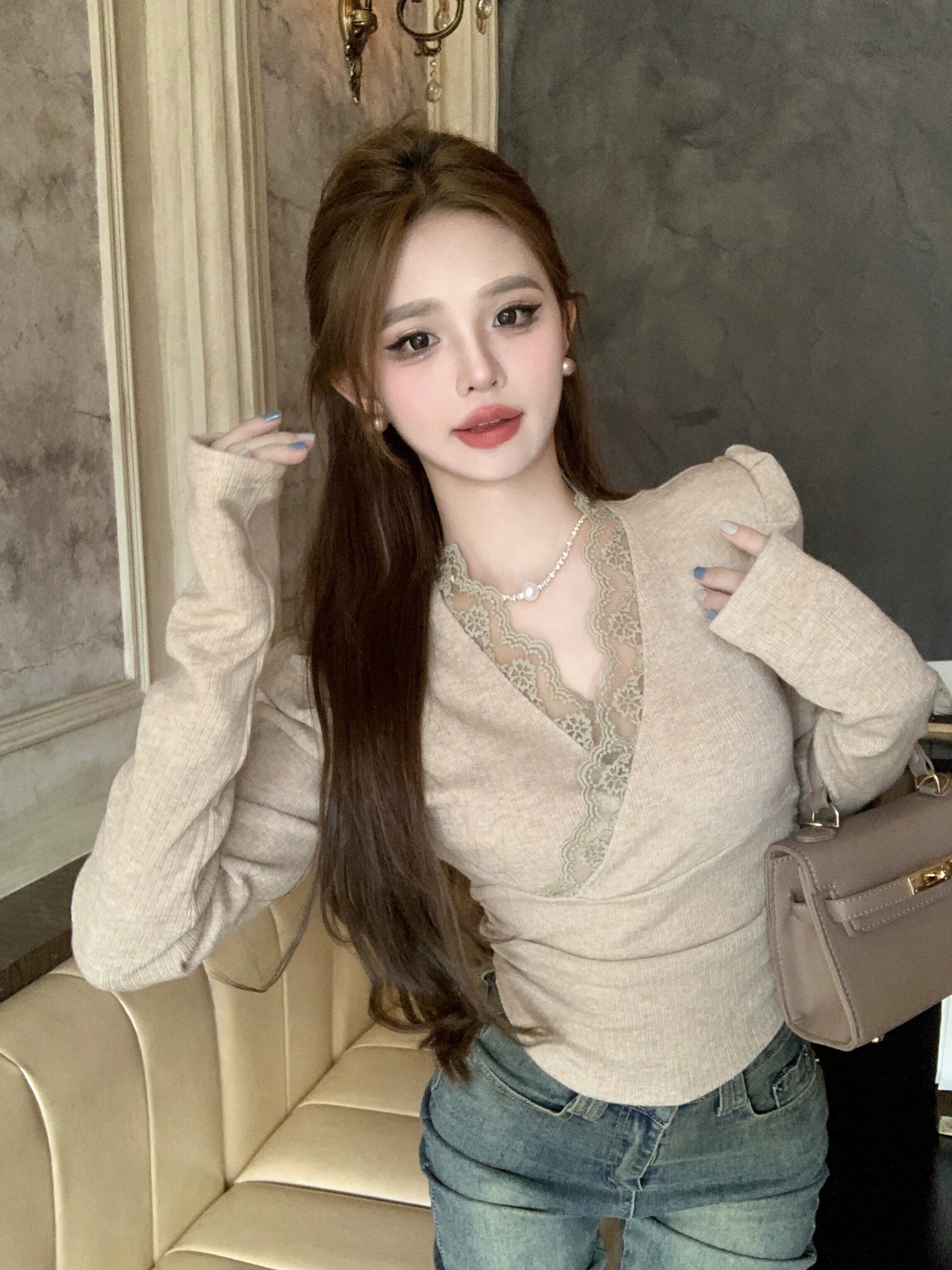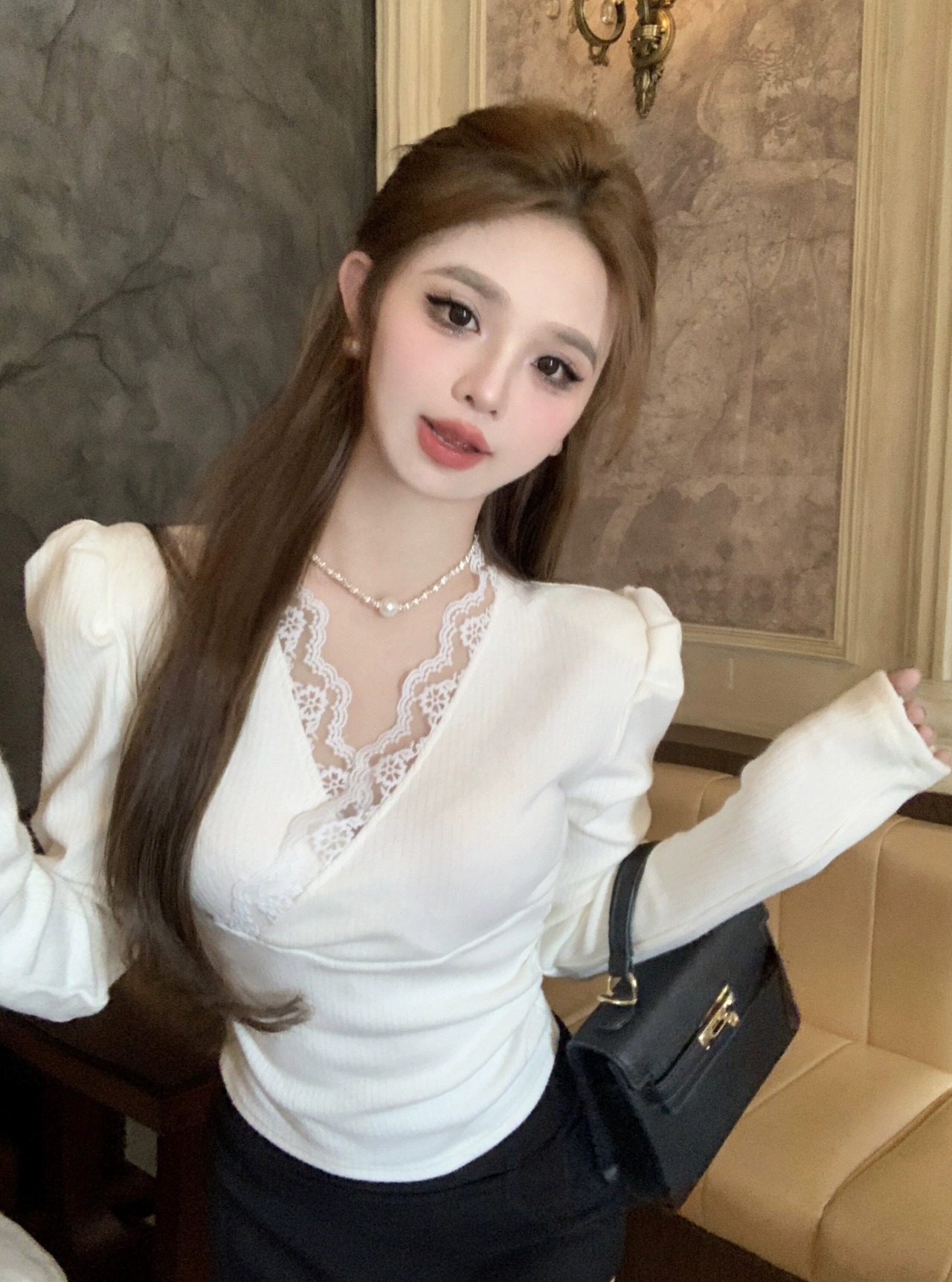 ボトリングシャツ白 tシャツ女性の秋と冬の新しい気質痩身インナーレーススプライシング v ネックセータートップ ホワイト オータム 秋物 ウィンター 冬物 Vネック nana87147591491 | modepoisson