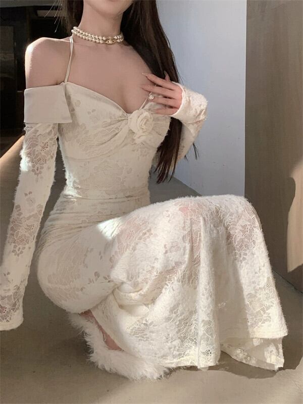 気質ドレスフレンチホワイトホルターネックストラップレーススカートレディース秋冬新スタイルインナーロングスカート オータム 秋物 ウィンター 冬物 nana70471747659 | modepoisson