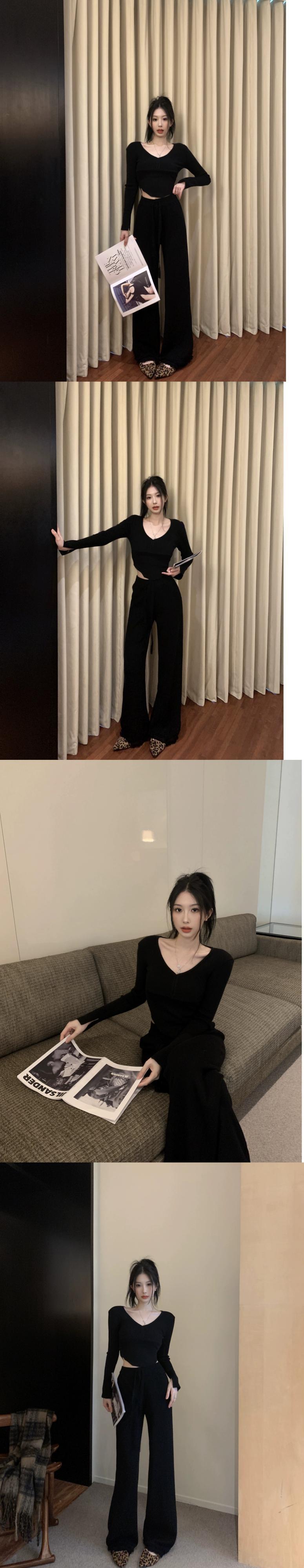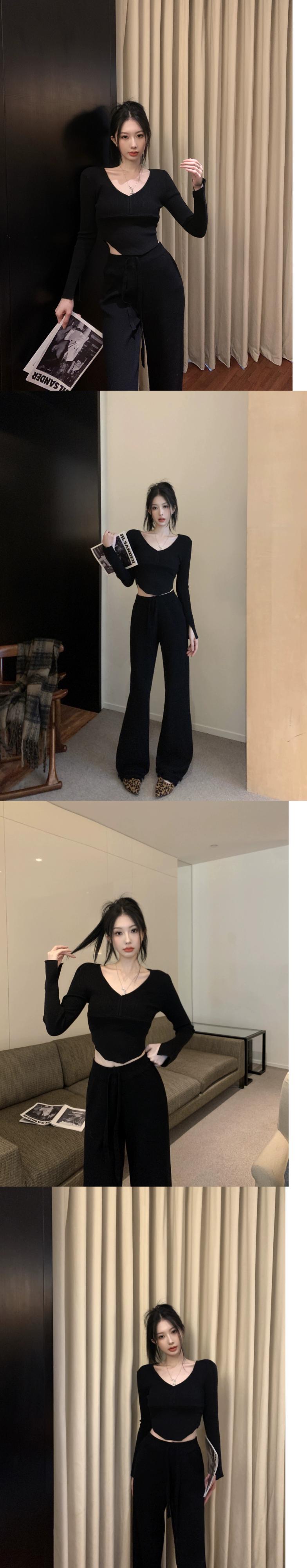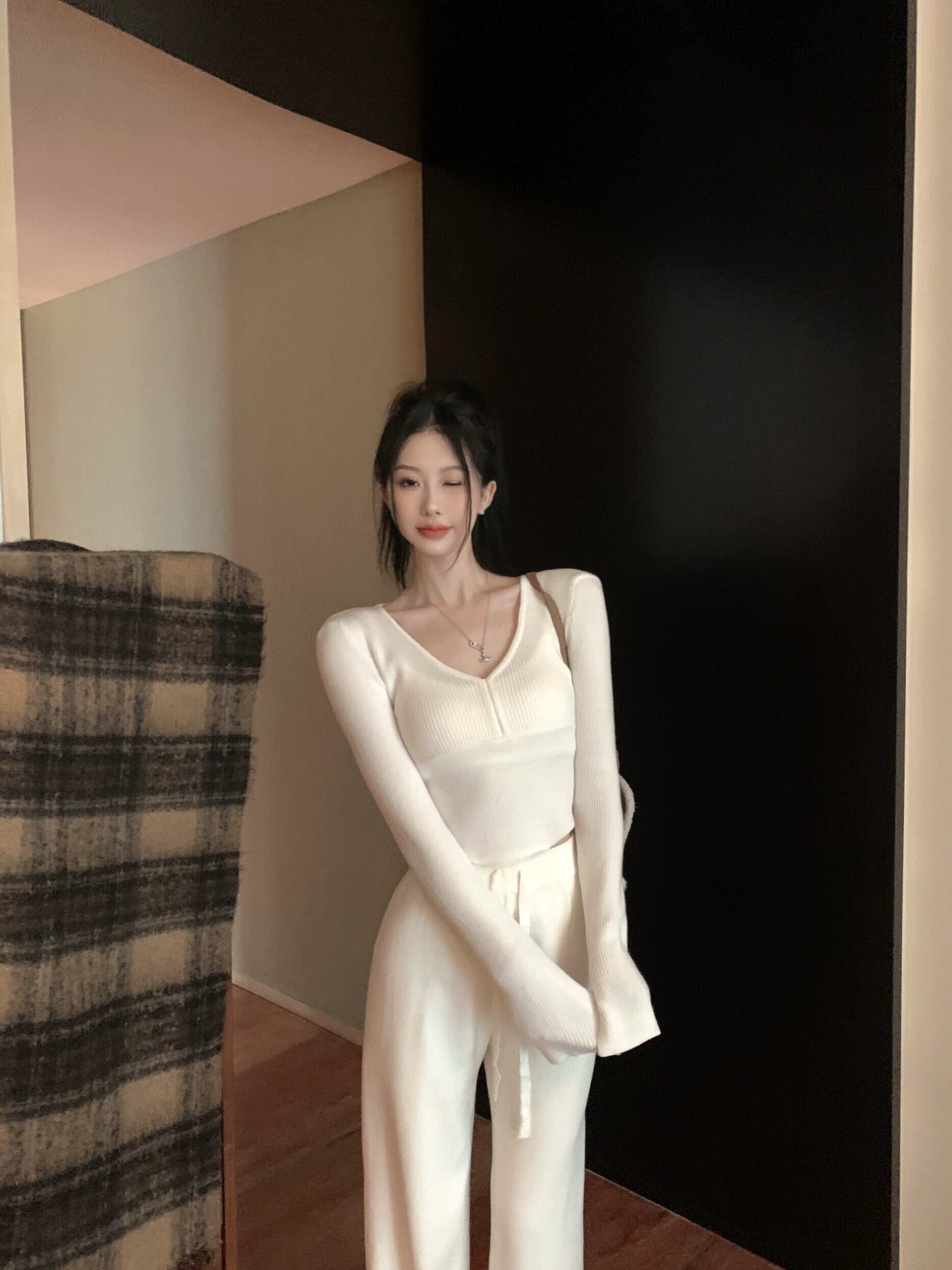 有能な女性のスーツ、純粋な欲望スタイル、ショート長袖トップ、ハイウエストニットワイドレッグパンツ、秋冬甘辛2点セット ロング 大人ガーリー スウィート キュート カジュアル オータム 秋物 ウィンター 冬物 ピュア nana8158723024 | modepoisson