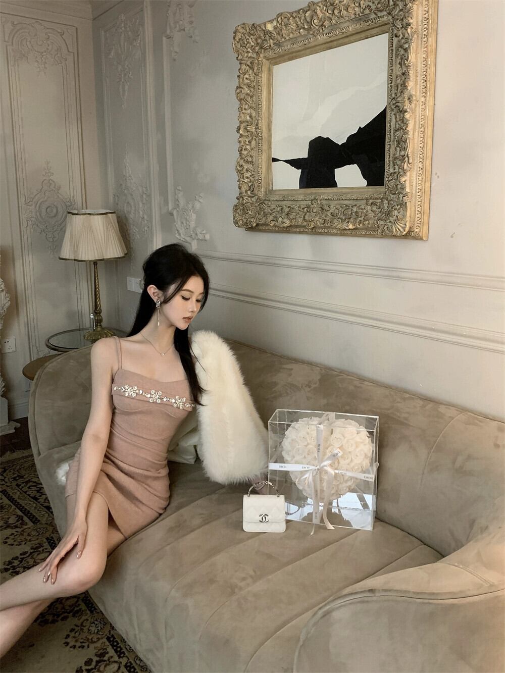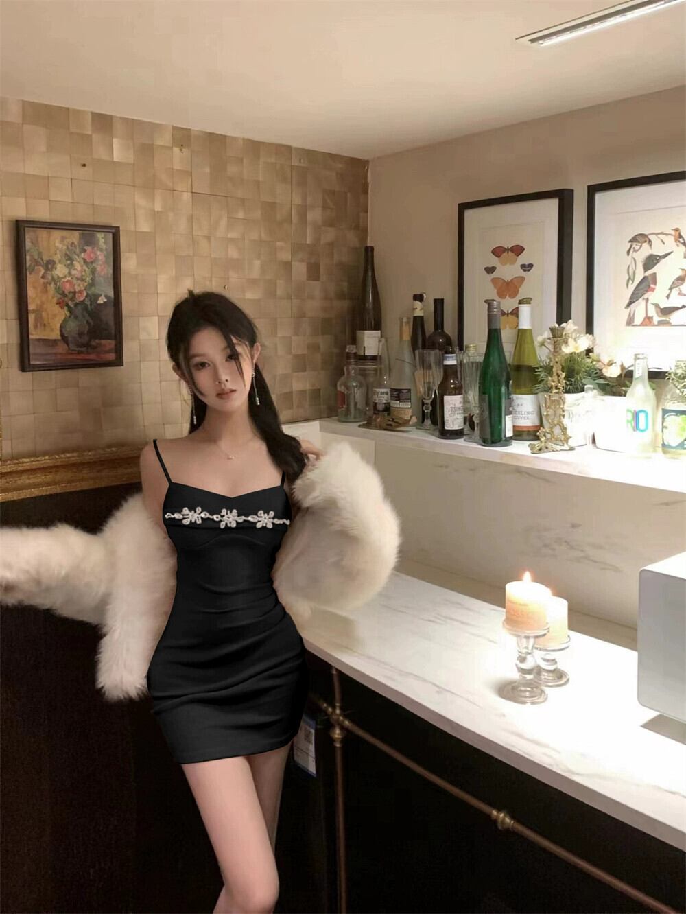 ホットサスペンダードレス黒の女性の秋と冬のインナーレイヤーとヘビーデューティネイルダイヤモンドチューブトップ痩身ウエストとヒップショートスカート ブラック オータム 秋物 ウィンター 冬物 nana63243317804 | modepoisson
