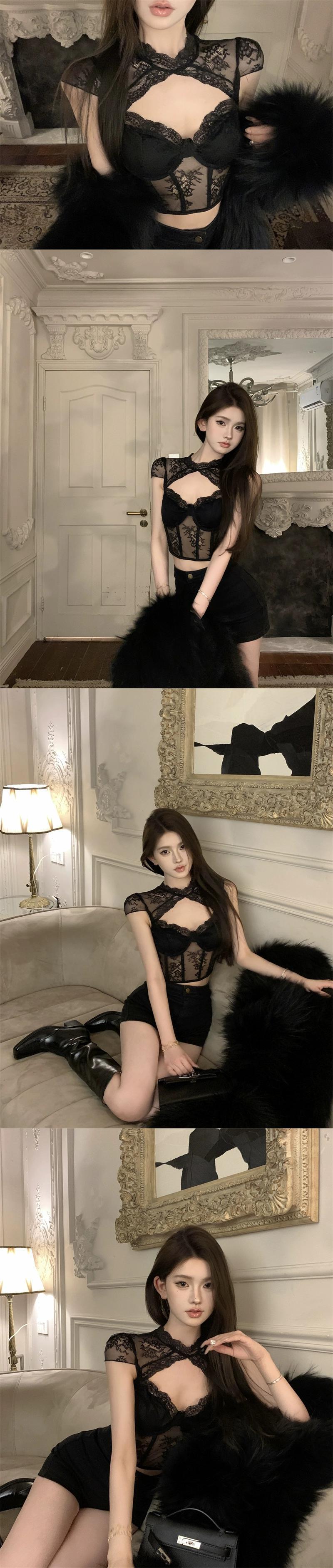 Pure Desire セクシーなホルターネックレースボトムフレンチスタイル - 秋と冬のスリムフィットショートトップ女性 オータム 秋物 ウィンター 冬物 nana39275209471 | modepoisson