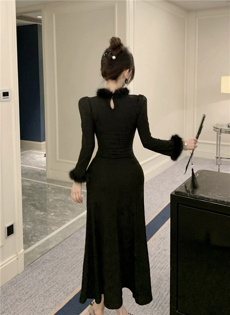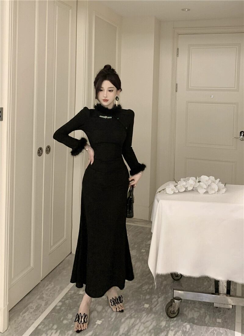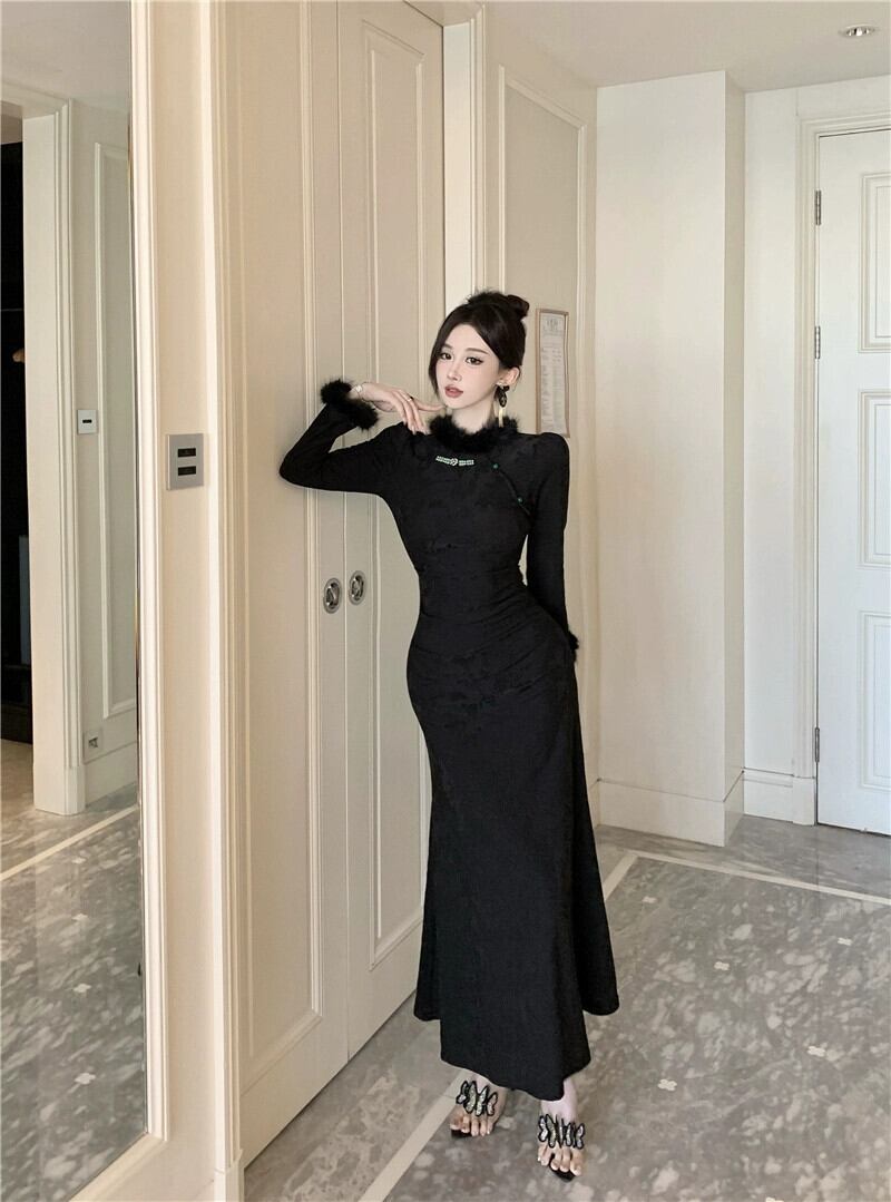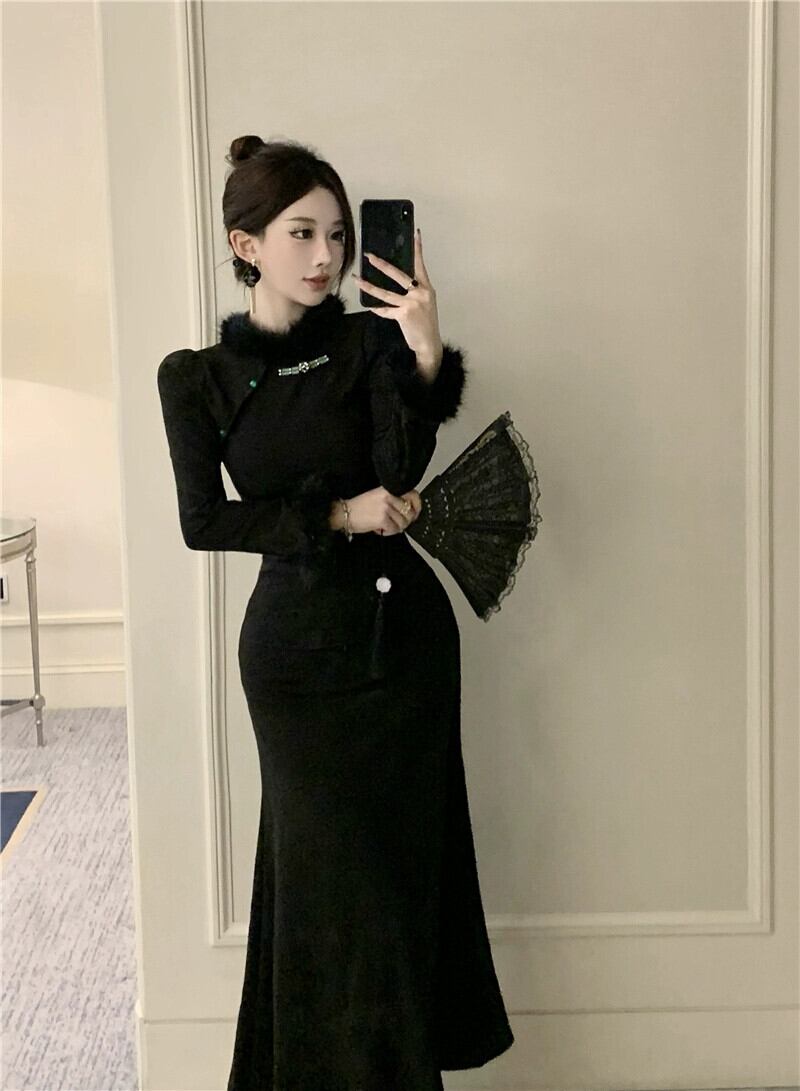 秋と冬の中国風のレトロなドレスの女性、ロング、ハイエンド、気質、ウエストを締める、改良されたチャイナドレススカート オータム 秋物 ウィンター 冬物 nana82059820331 | modepoisson