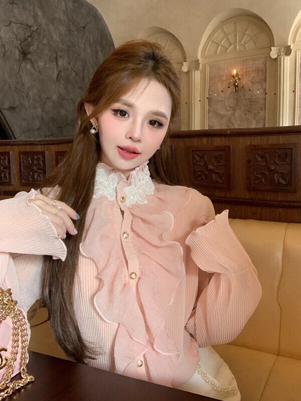 エドフリルパッチワークシャツレディース秋冬新作フレンチニッチベルスリーブスタンドカラーシフォントップと合わせて着用可能 オータム 秋物 ウィンター 冬物 nana52768324916 | modepoisson