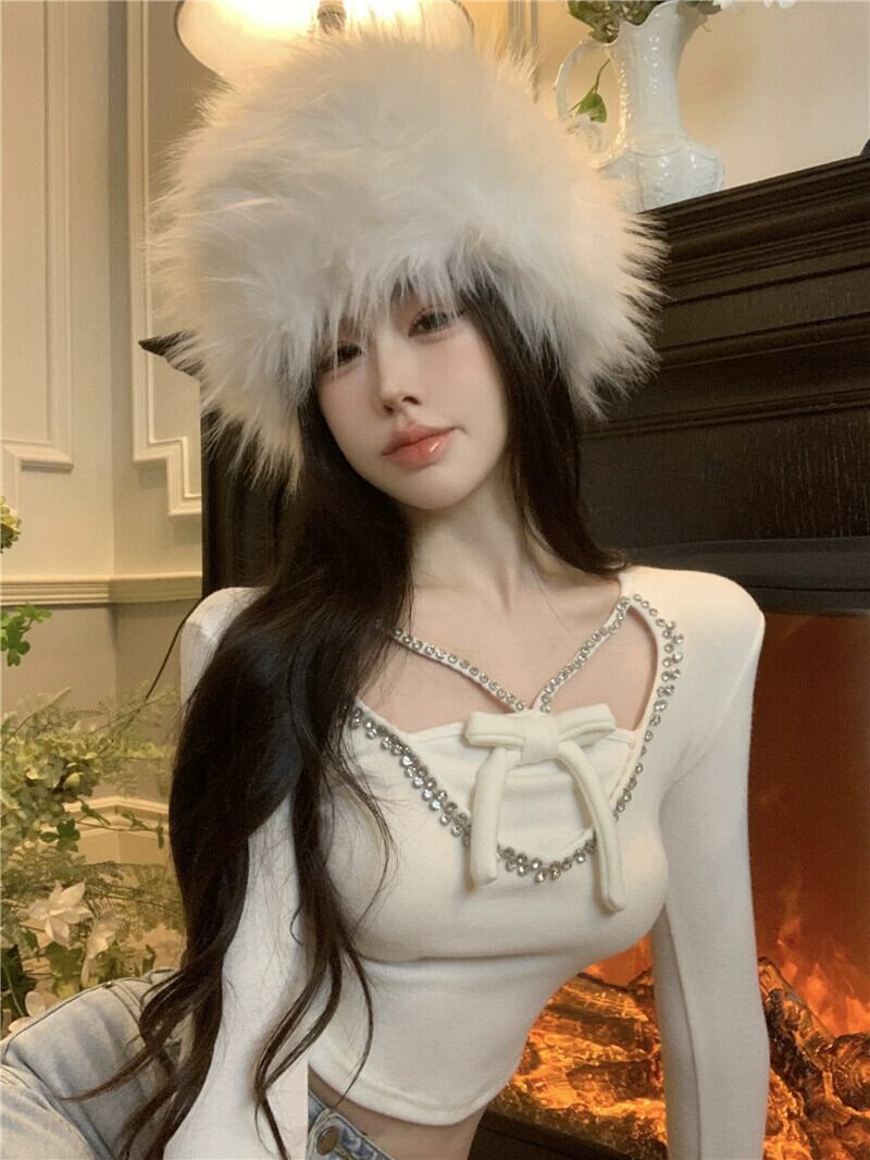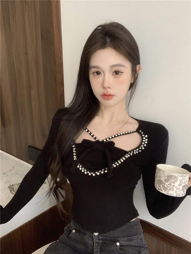 黒のショート t シャツ重工業ネイル ダイヤモンド愛中空ニットインナースリム長袖ボトムシャツトップス女性冬の ロング ブラック ウィンター 冬物 Tシャツ nana93076109679 | modepoisson