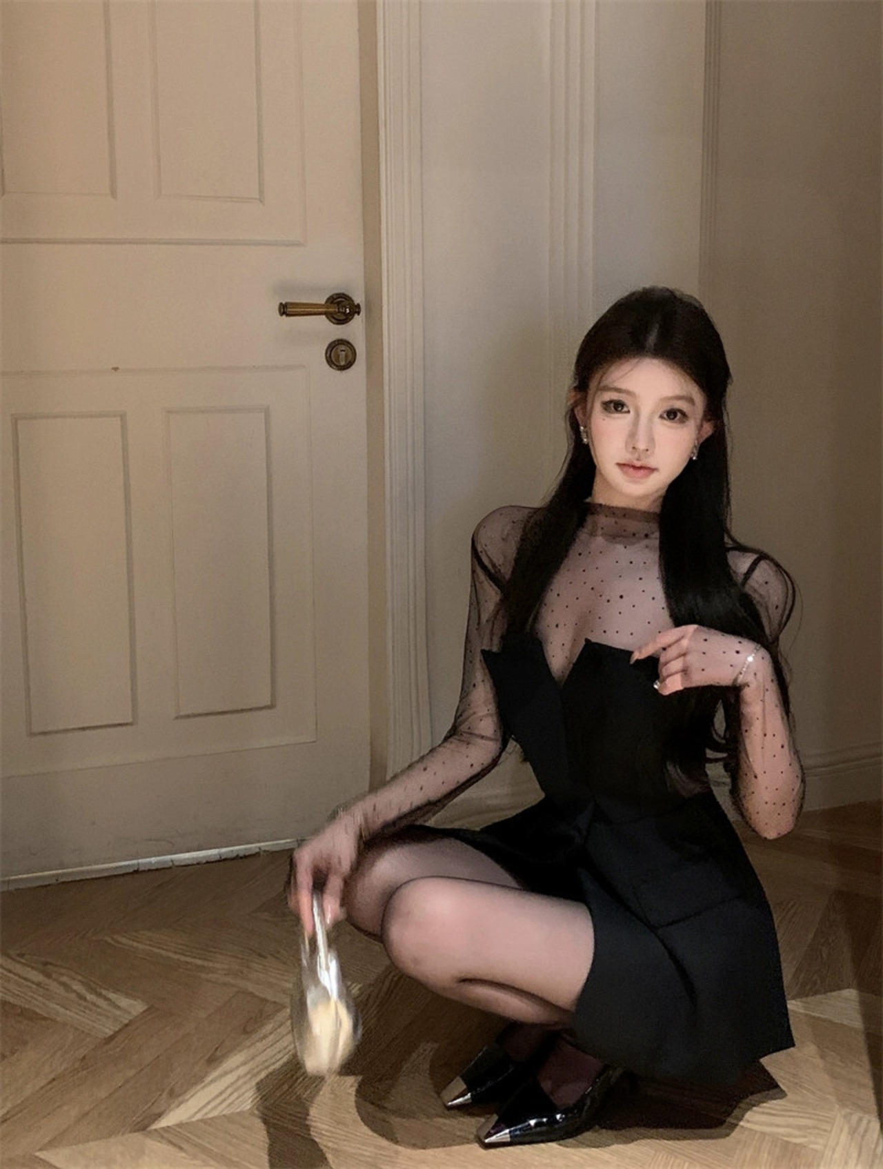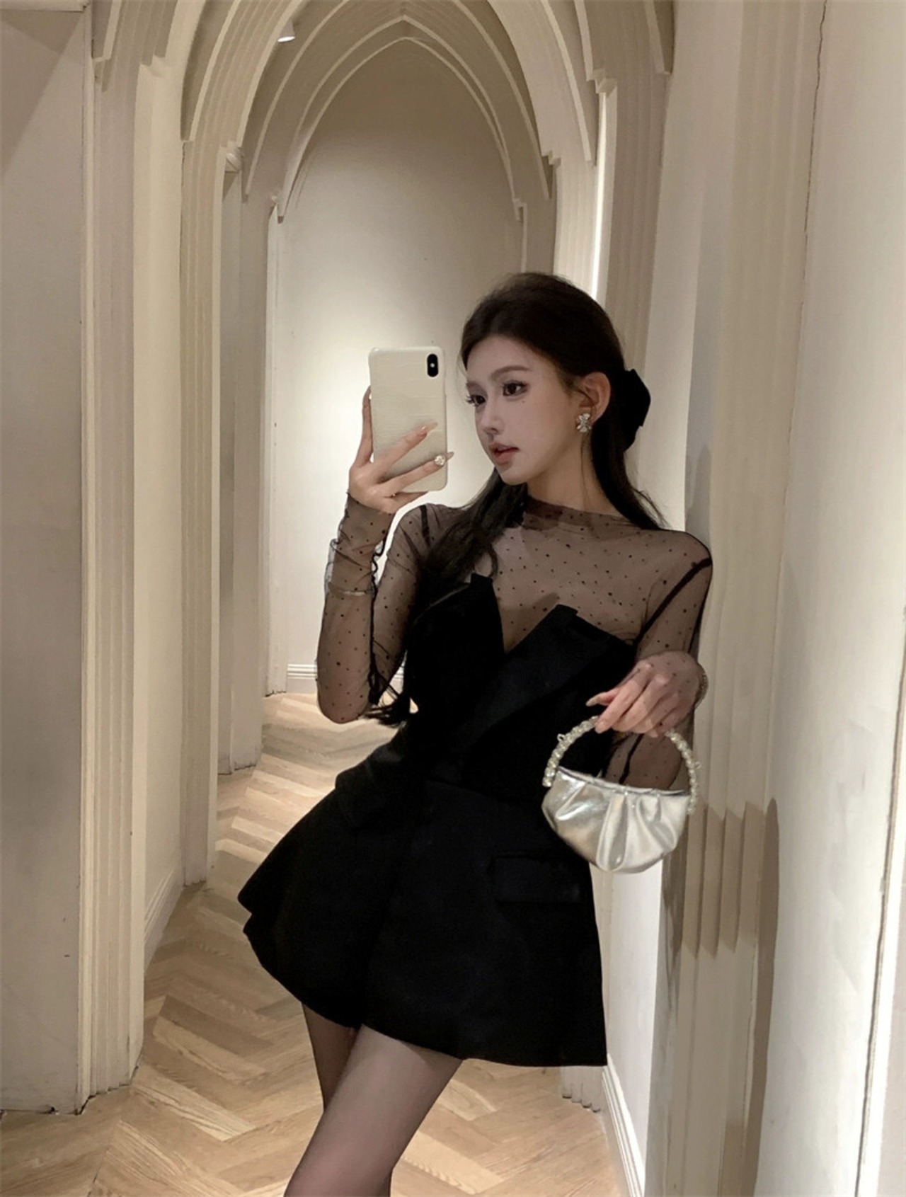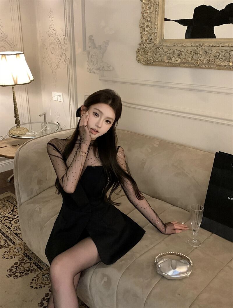 秋冬メッシュチューブトップ長袖Tシャツスリムブラックトップロイヤルシスター気質社交家スーツレディース2点セット ロング オータム 秋物 ウィンター 冬物 nana22801766109 | modepoisson