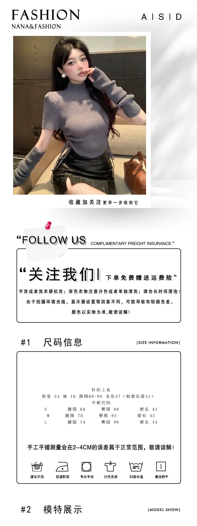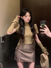 色:赤いニットトップ,ライトカーキのニットトップス,グレーニットトップ,黒スパンコールスカート,ゴールドスパンコールスカート