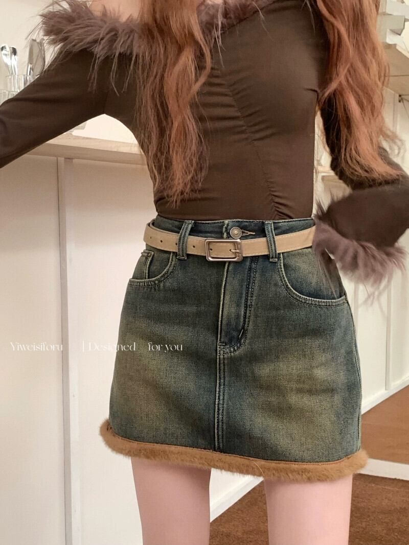 -ウエストスリムスカート秋と冬、ベルベットと厚みのあるデニムスカート、露出防止スカート、女性のレトロなAラインスカート オータム 秋物 ウィンター 冬物 nana6681228390 | modepoisson