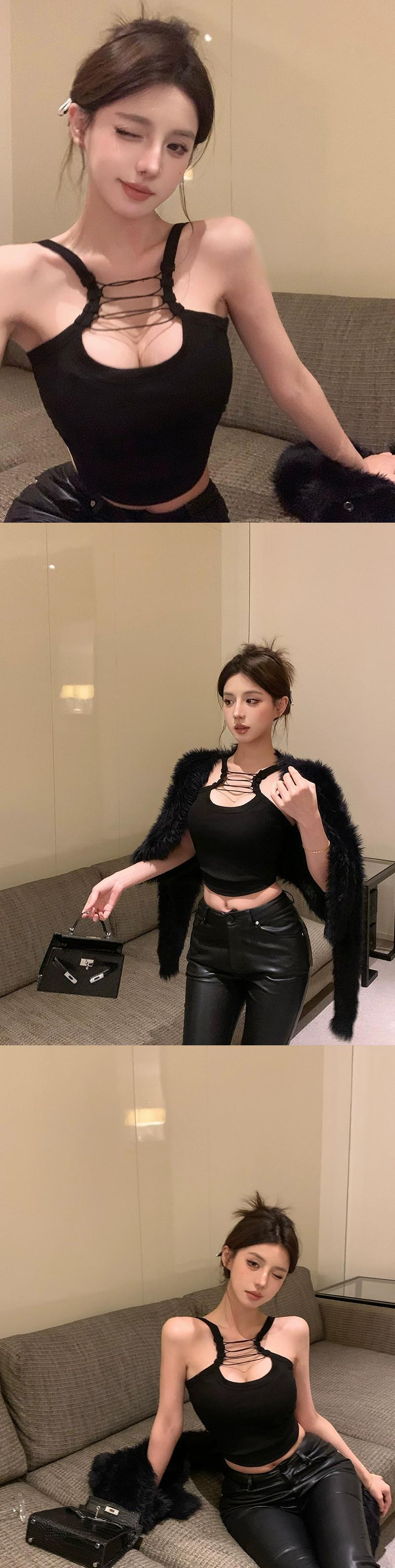ホットセクシーな中空キャミソール女性の秋と冬のインナー重ね着黒ノースリーブトップ胸パッド付きアウターウェア ブラック オータム 秋物 ウィンター 冬物 nana87186469193 | modepoisson