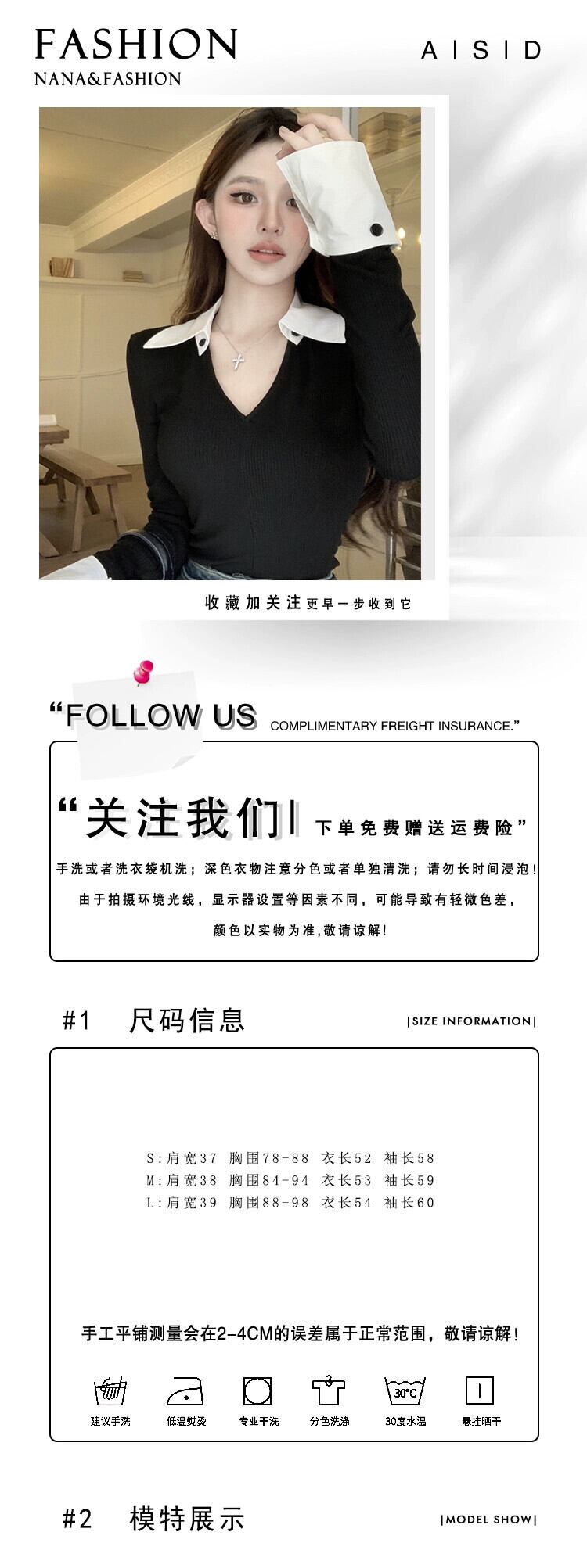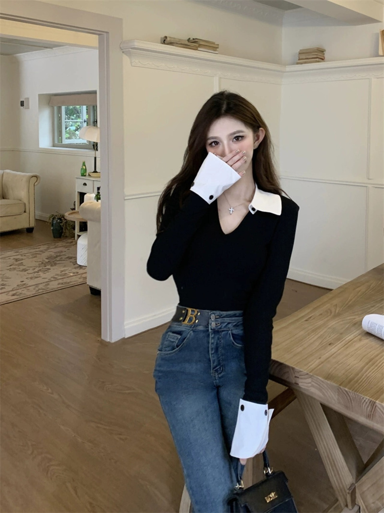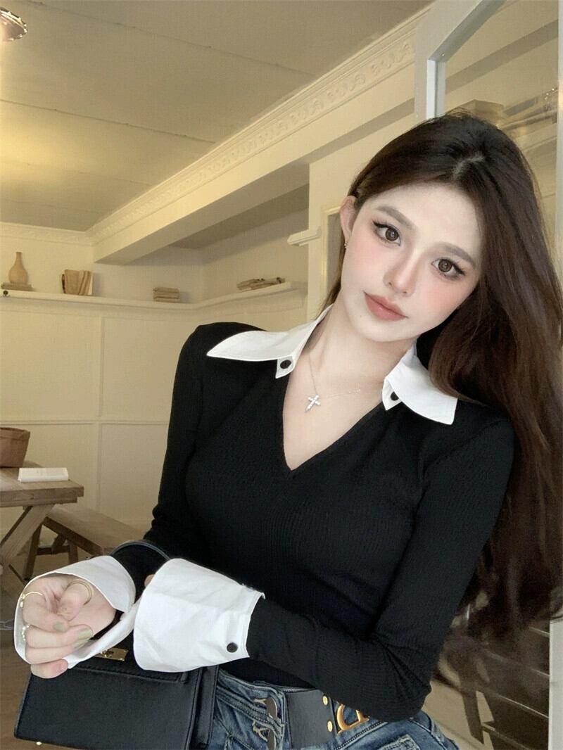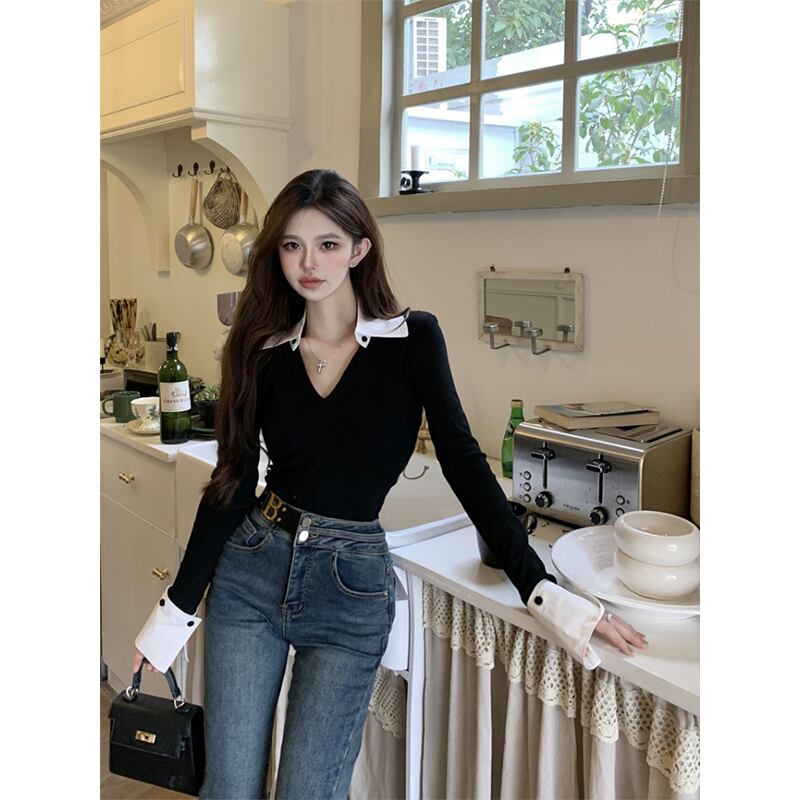 センススプライシング v ネック長袖 tシャツニッチシックなボトリングシャツスリムセクシーなスリムトップ女性初秋 ロング オータム 秋物 Vネック nana30785259368 | modepoisson