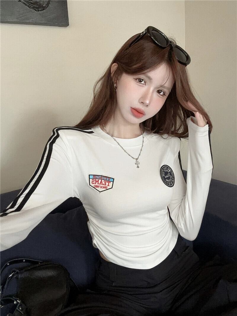 アメリカンホットガールレトロスリムTシャツニッチスリムシックショートボトムシャツラウンドネック長袖トップ秋 ロング オータム 秋物 Oネック nana23667989827 | modepoisson