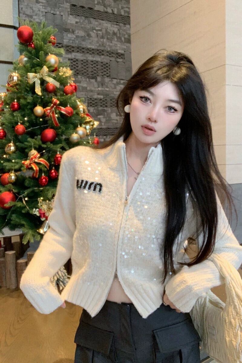 小さなスタイルのセーターの女性の秋と冬のニットカーディガンデザインソフトワックス状スパンコールヘビージッパーショートジャケット オータム 秋物 ウィンター 冬物 nana32392892881 | modepoisson
