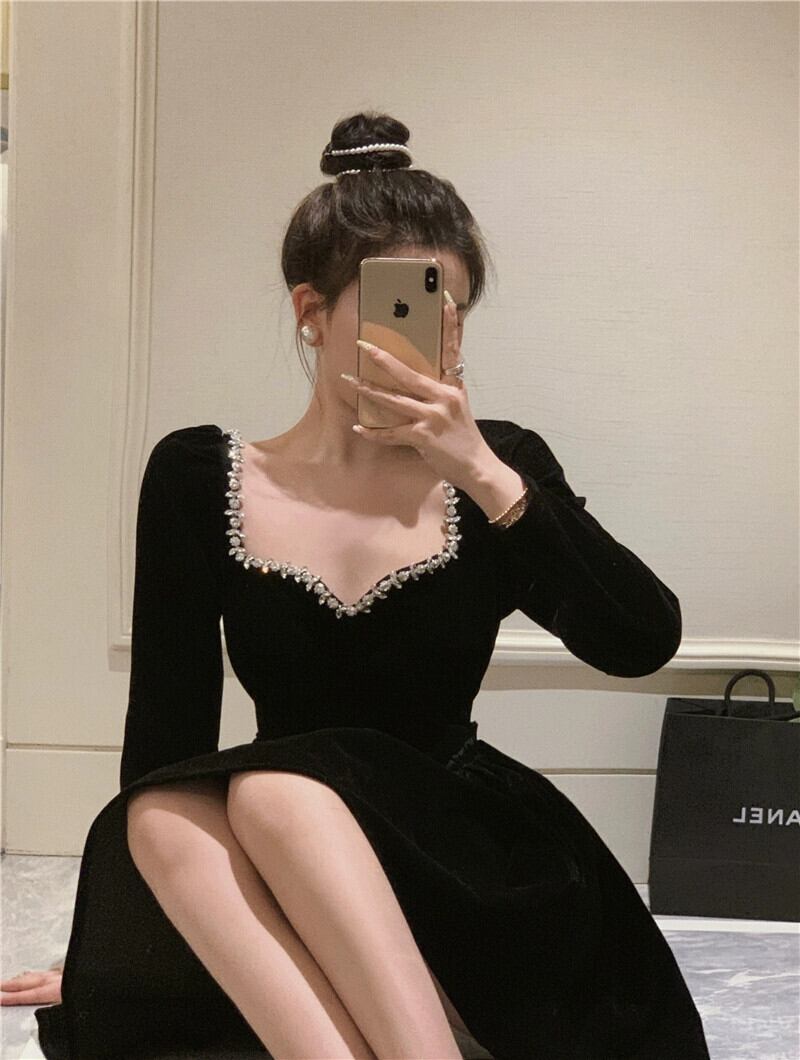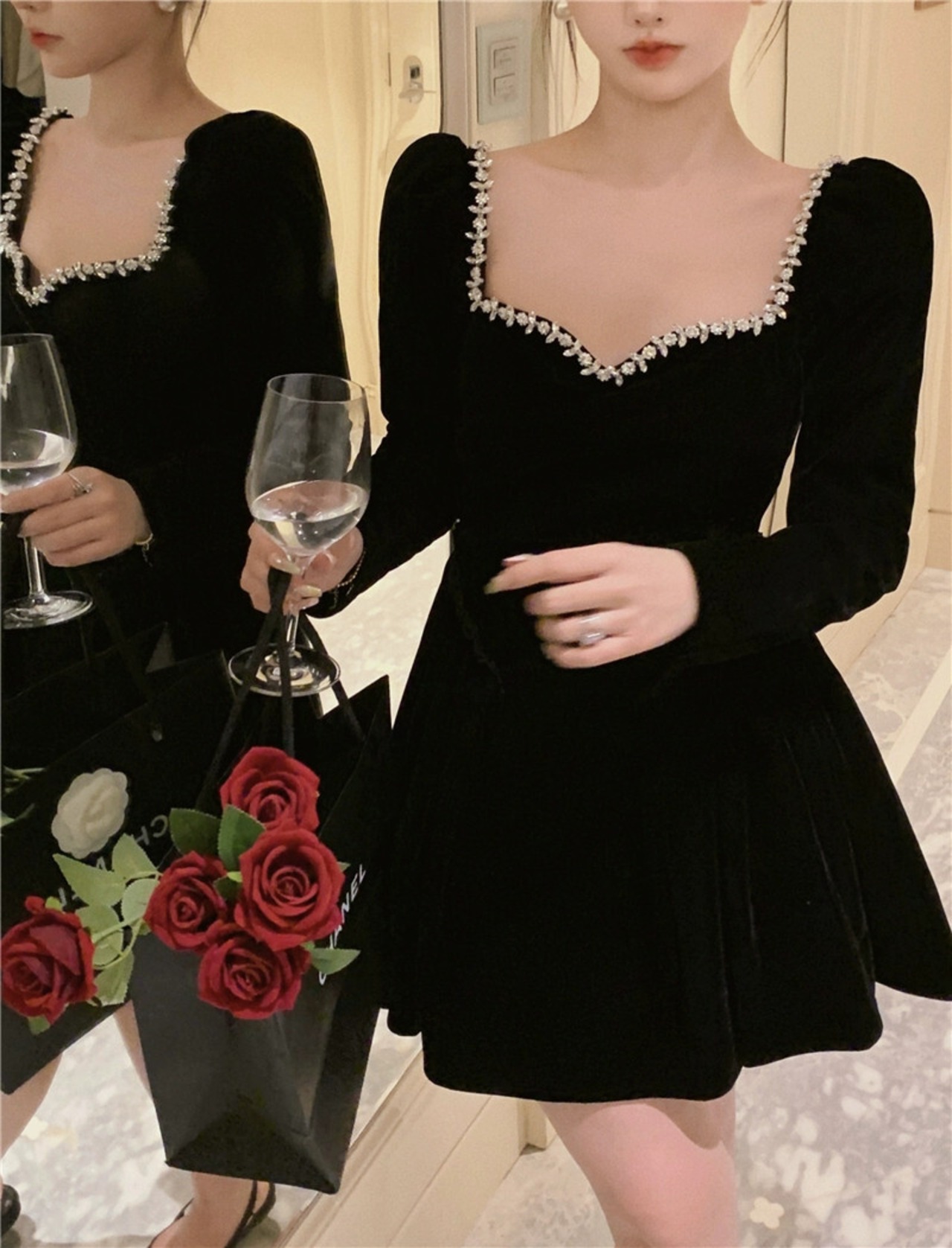 スクエアネックドレスブラックレトロベルベットスカート女性の秋と冬のウエスト痩身フランスのティーブレイク逃亡王女のドレス オータム 秋物 ウィンター 冬物 スクウェア nana94910507844 | modepoisson
