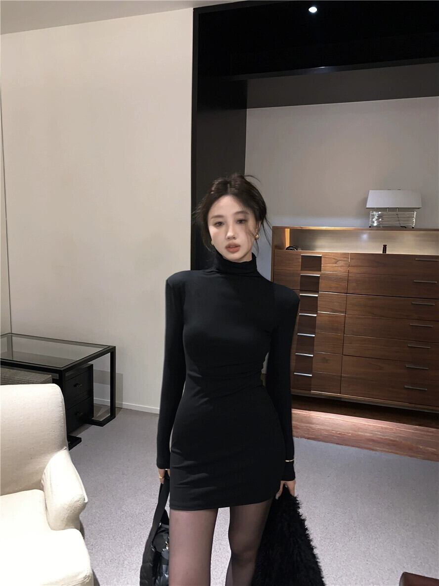 黒のタートルネックドレス、ウエストを締める、長袖、ヒップにぴったりフィットするインナーレイヤー、汎用性の高いショートスカートの女性、新しい秋冬スタイル ロング ブラック オータム 秋物 ウィンター 冬物 nana17282956378 | modepoisson
