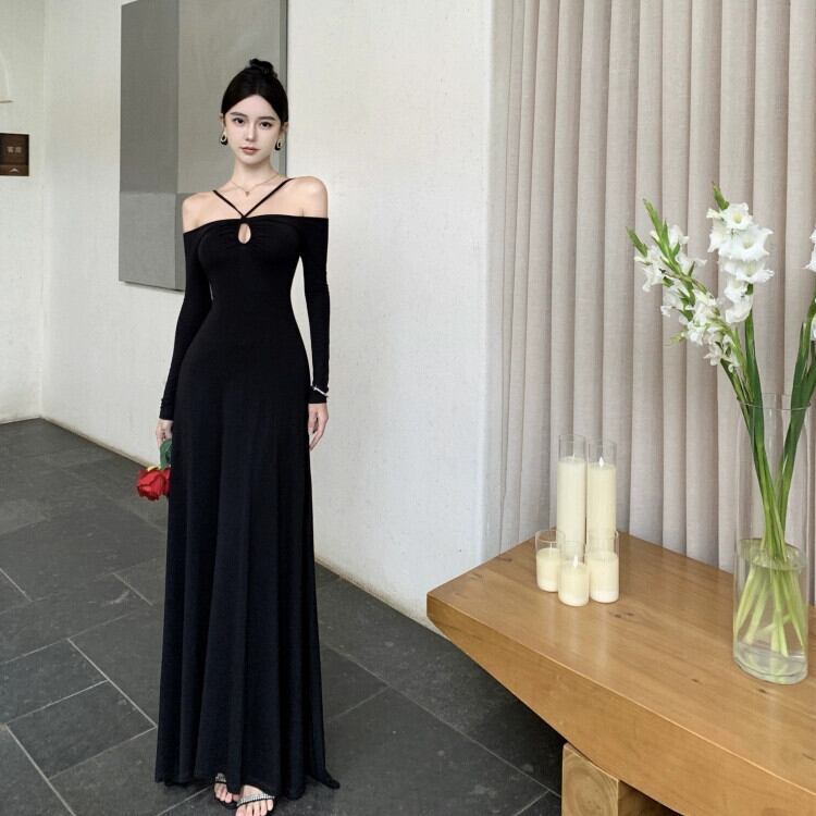 ユニークなドレス、超美しい、女性の秋と冬の長袖スリムスカート、フレンチボトムの黒の高級ロングスカート ブラック オータム 秋物 ウィンター 冬物 nana5201068231 | modepoisson