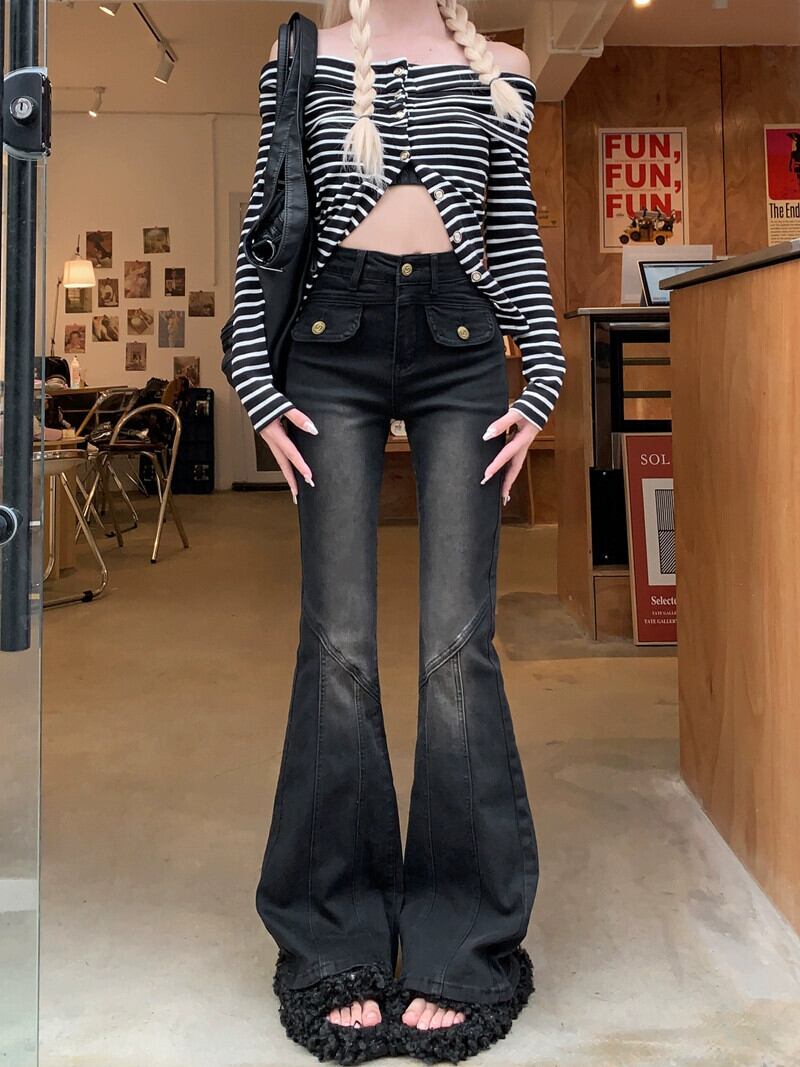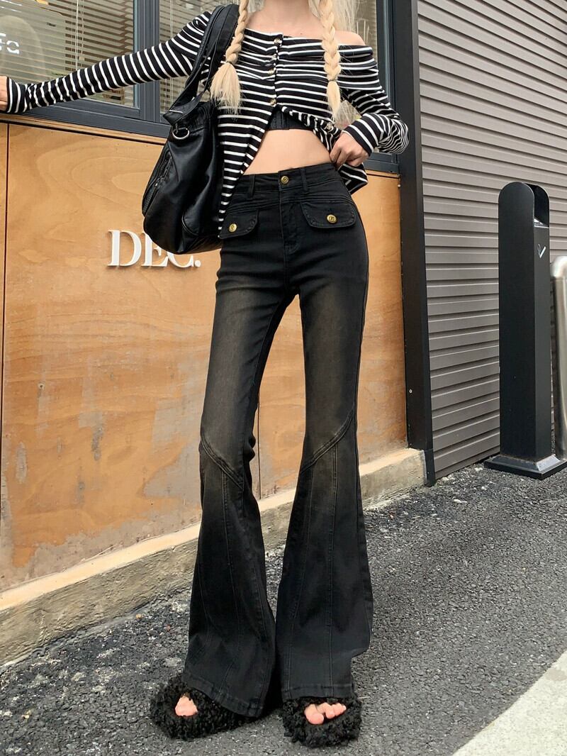 -伸縮性のあるデザインのウエストジーンズ、ストレートレッグマイクロフレアホースシューパンツ、ジッパーパンツレディース、2023秋の新しいスタイル レッド エラスティック オータム 秋物 nana73629556729 | modepoisson