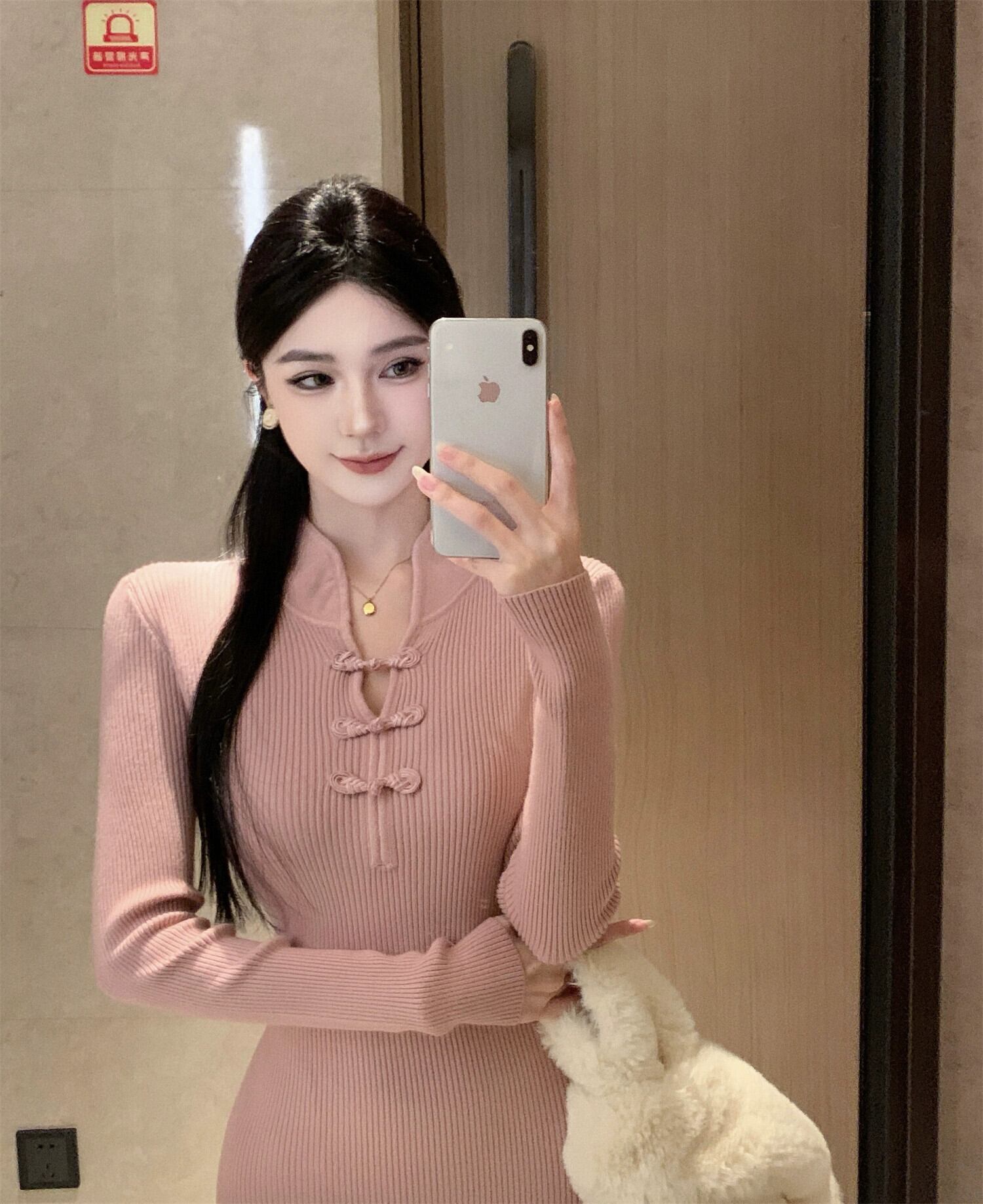 セクシーなヒップカバーニットドレス、新しい中国風国民風チャイナドレス、長袖、スリムフィッシュテールロングスカート、女性の秋と冬 オータム 秋物 ウィンター 冬物 nana40630790782 | modepoisson