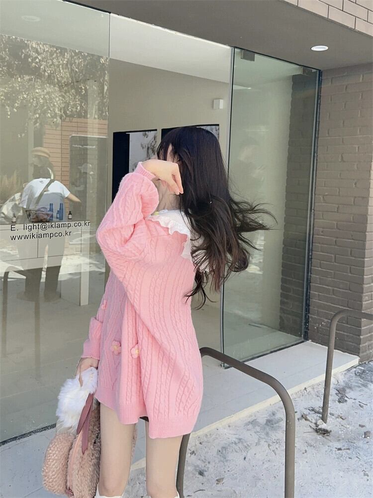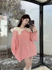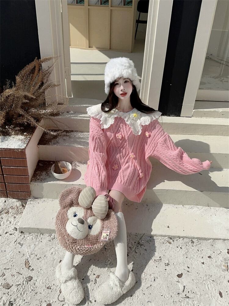 レーススプライシングフラワーセーター怠惰なスタイルルーズベビードールカラーセーター女性の秋と冬の新しいミッドレングストップ オータム 秋物 ウィンター 冬物 フラワーデザイン nana61950847868 | modepoisson