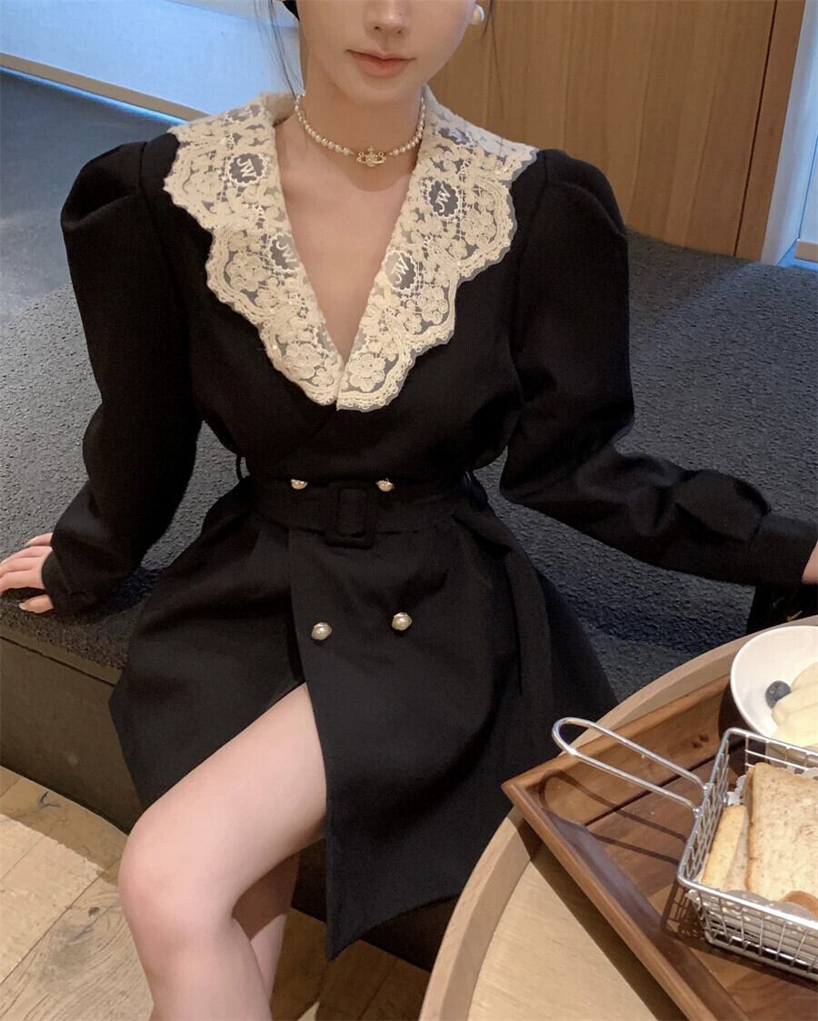 ヘップバーンスタイルのフレンチドレスの女性の秋と冬のハイエンドブラックレース V ネックウエストダブルブレストスーツのスカート オータム 秋物 ウィンター 冬物 Vネック nana19752496385 | modepoisson