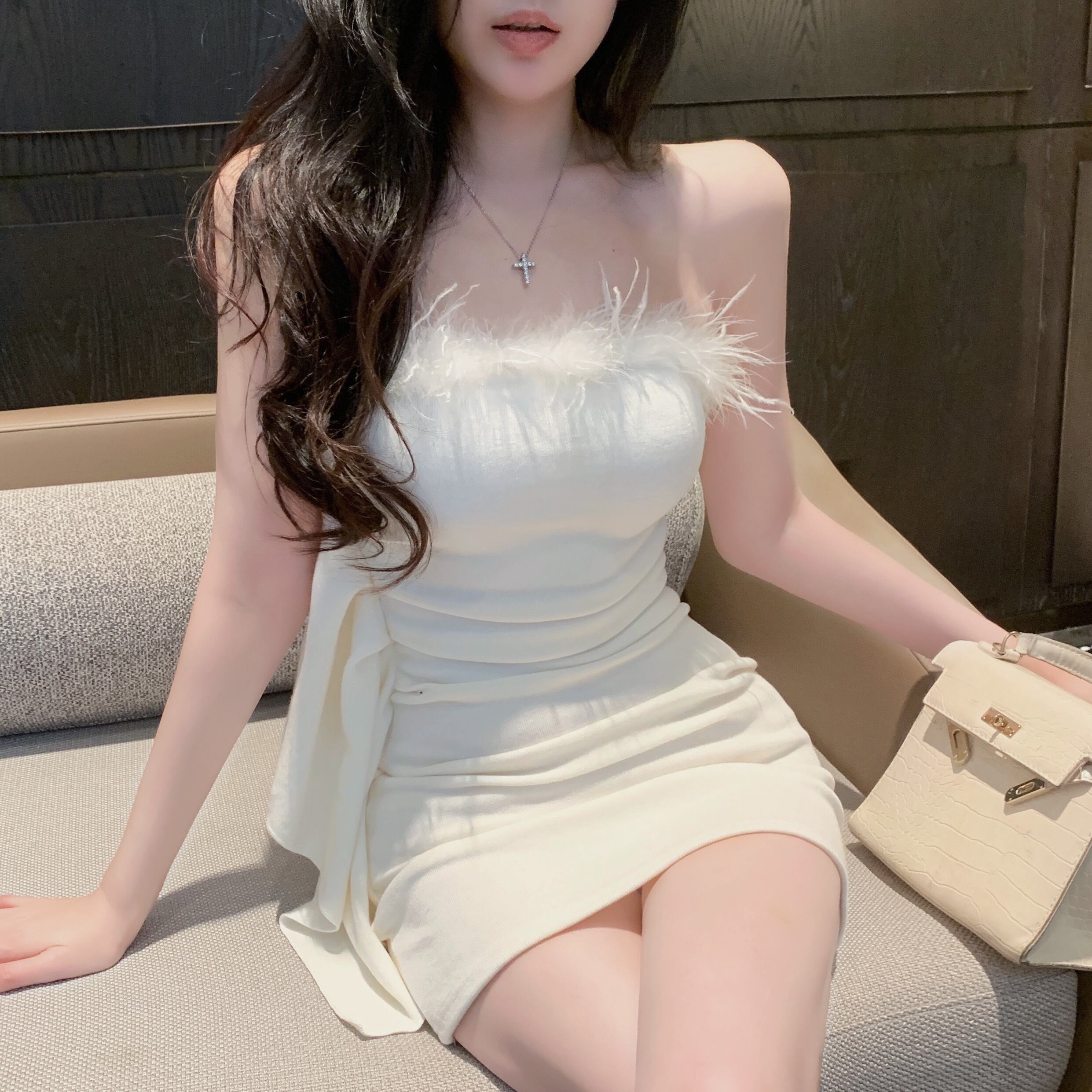 ホットスプライシングダチョウの羽のチューブトップドレス女性の秋と冬の新しいスタイルの気質ウエスト不規則なヒップカバーショートスカート オータム 秋物 ウィンター 冬物 nana9874766586 | modepoisson