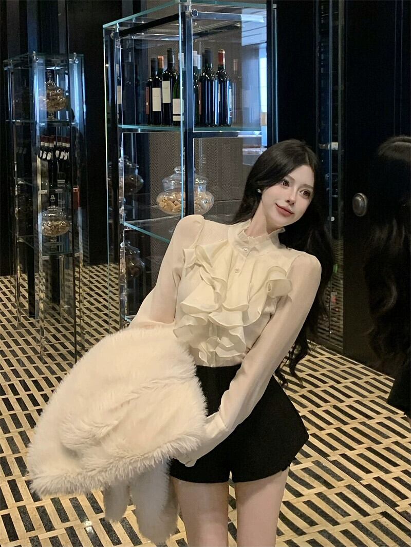 フレンチフリルカラー長袖シャツ 2023 新しい女性の秋と冬のスリムニッチデザインシャツボトリングシャツトップ ロング オータム 秋物 ウィンター 冬物 nana43871018672 | modepoisson