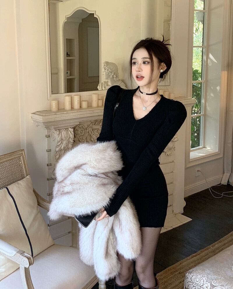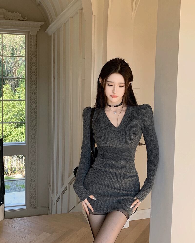 ニットドレスの女性の秋と冬の痩身 V ネックボトムスカート新しいスタイルのインナーセータースカート オータム 秋物 ウィンター 冬物 Vネック nana40293893682 | modepoisson