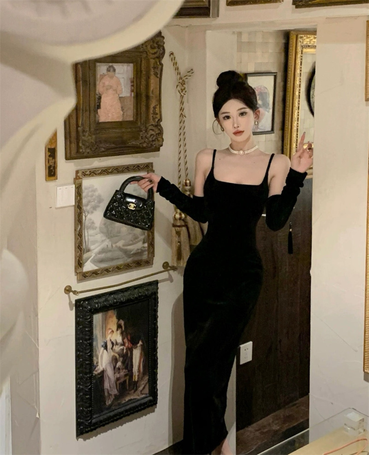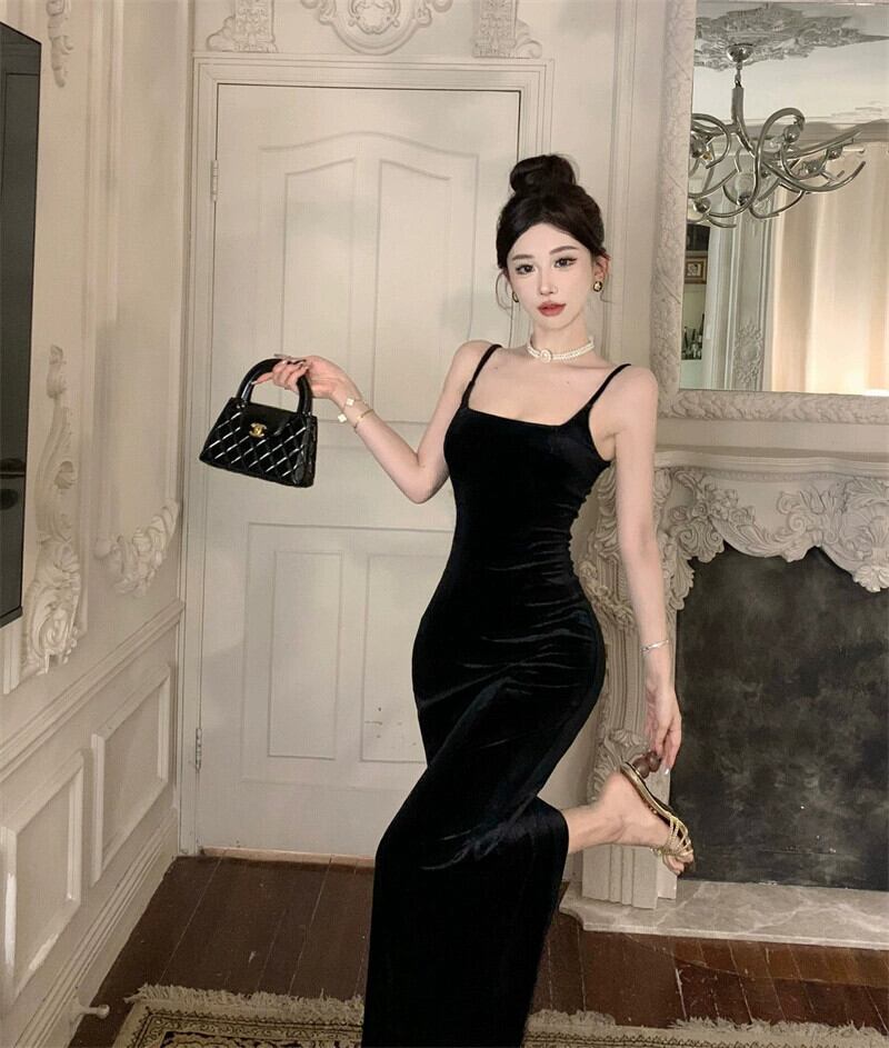 フランスのヒップハグドレスベルベットの女性の秋と冬のハイエンド痩身と気質黒のスクエアネックサスペンダーロングスカート ブラック オータム 秋物 ウィンター 冬物 スクウェア nana59070418345 | modepoisson