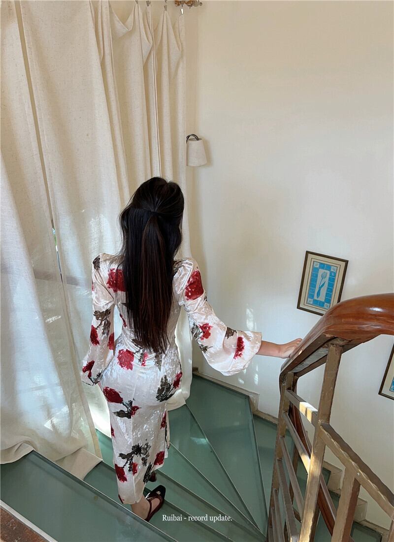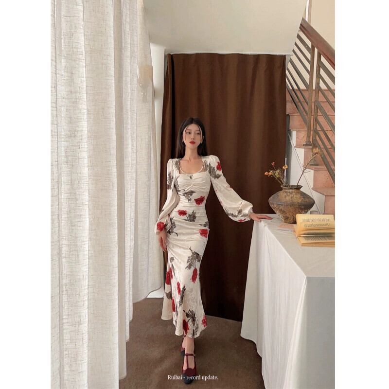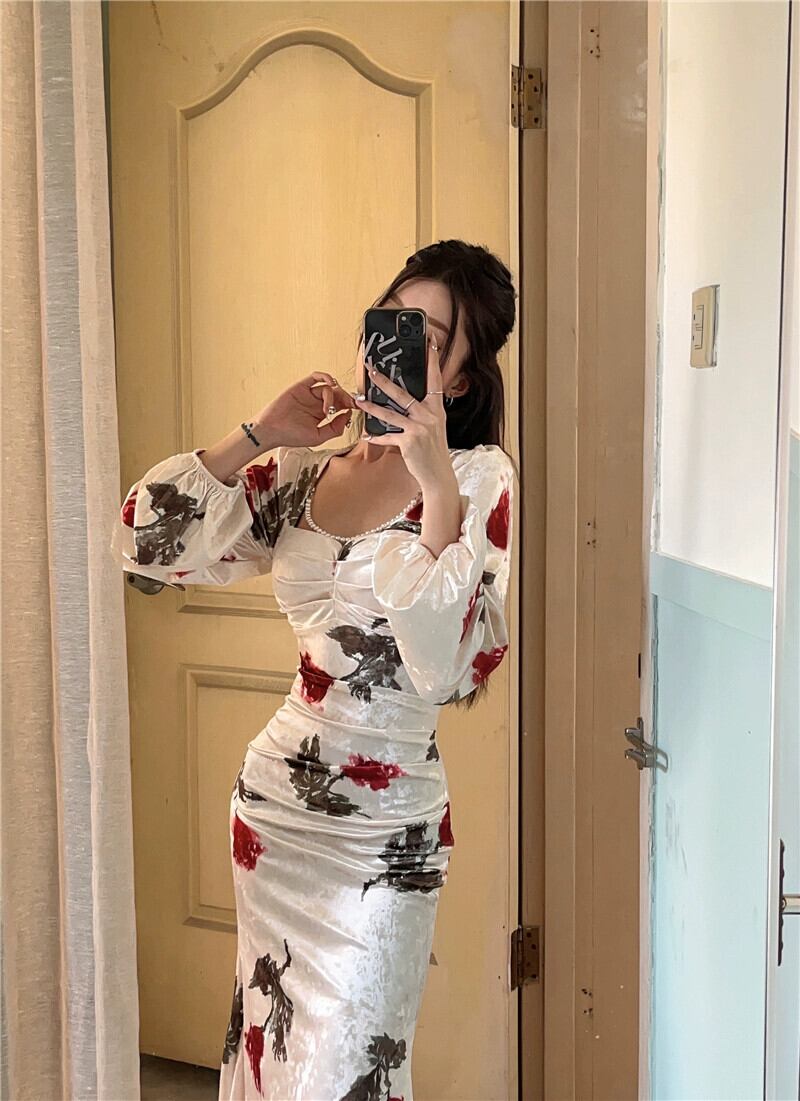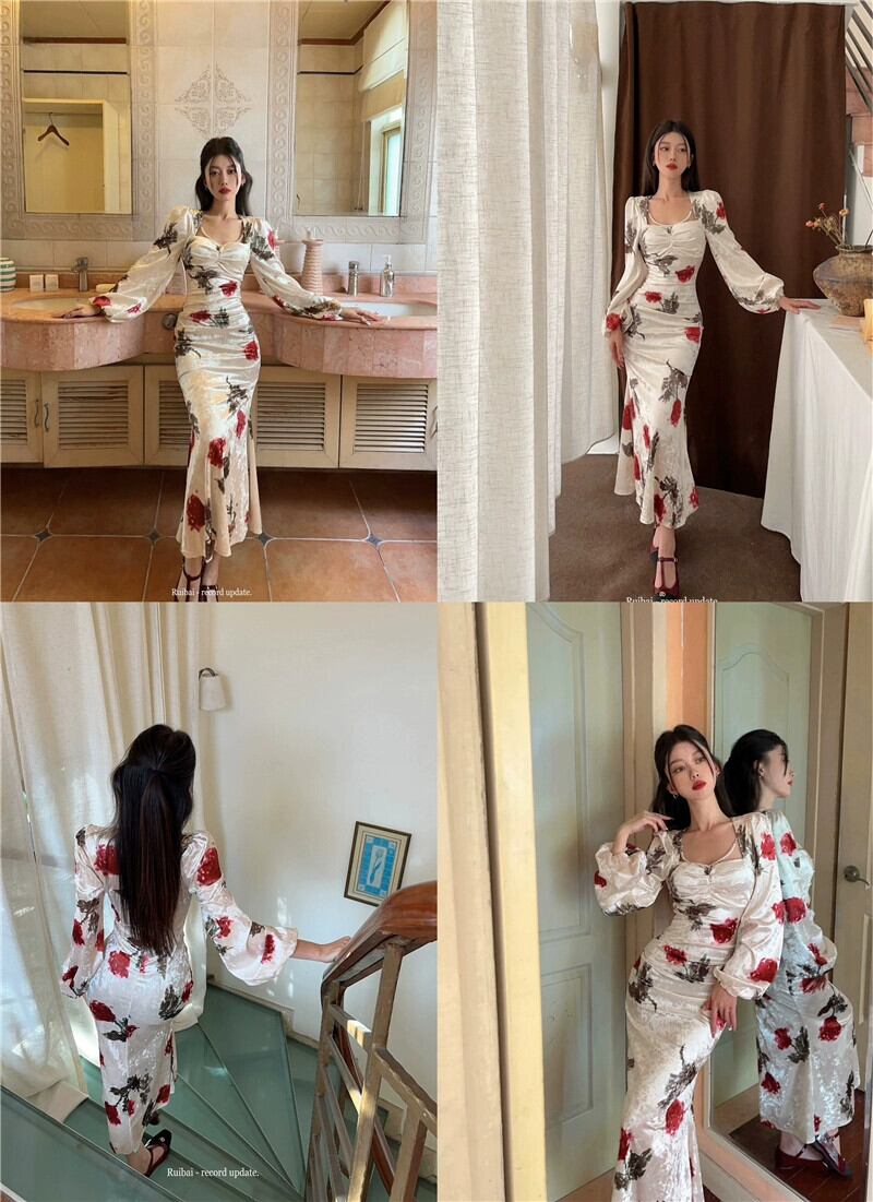 スクエアネック花柄長袖ドレスベルベットハイエンドフレンチスカートウエストバッグヒップフィッシュテールロングスカート女性秋と冬 オータム 秋物 ウィンター 冬物 スクウェア nana43245619329 | modepoisson
