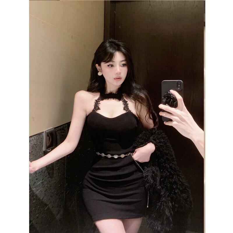 レースホルターネックサスペンダードレス黒スリムフィットヒップスカート女性の秋と冬の新しいウエストを締める気質ショートスカート ブラック オータム 秋物 ウィンター 冬物 nana39196698732 | modepoisson